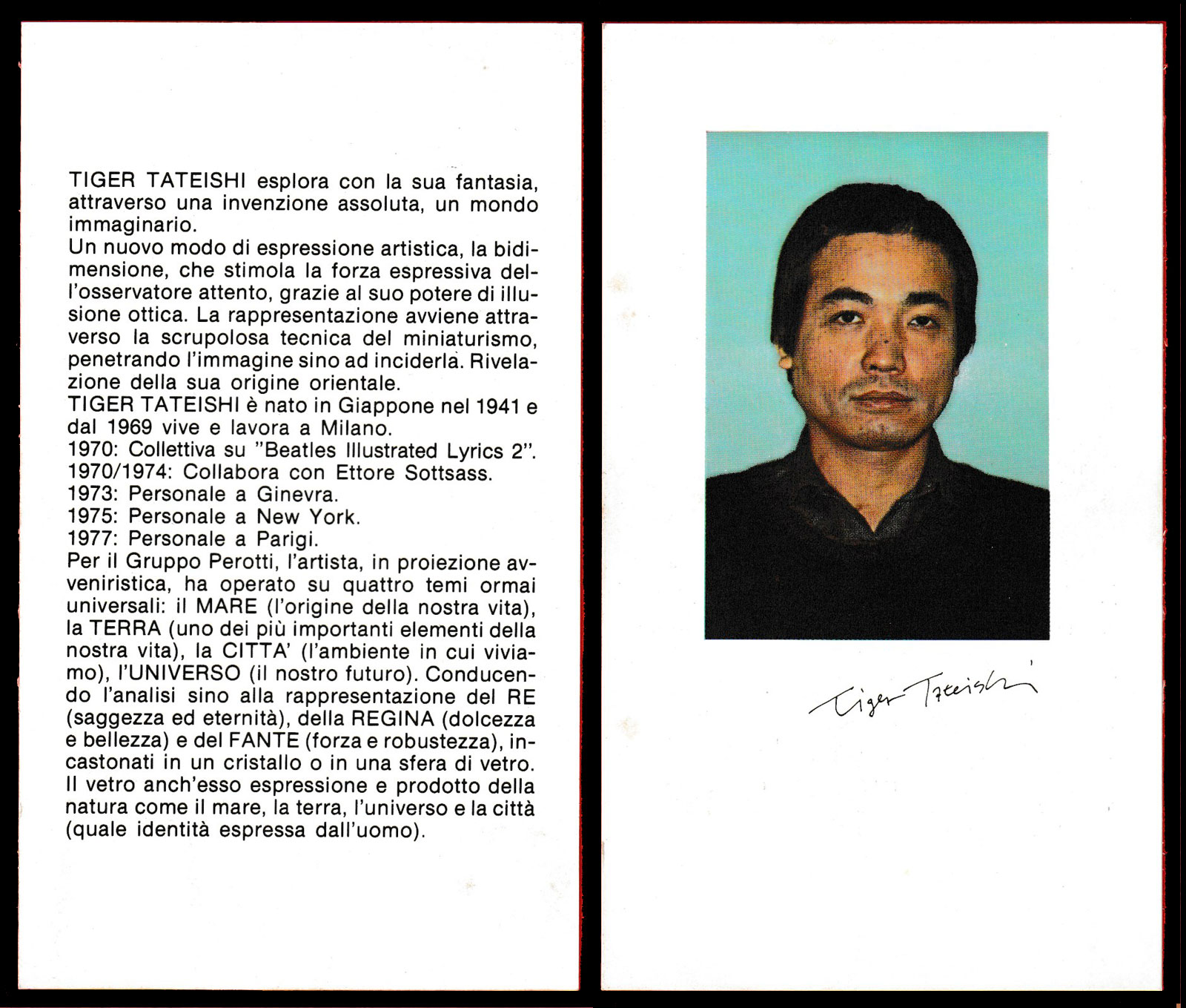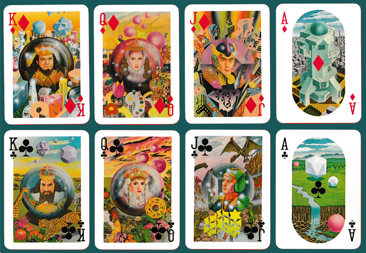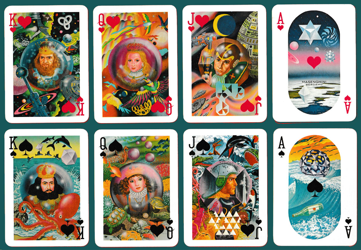 Any customer receiving these cards as a Christmas present from Gruppo Perotti in 1979 must surely have been delighted. Japanese artist Tiger Tateishi (1941-1998) has set his courts in an imaginary, fantasy, space-age world using a fabulous range of colours. The four suits symbolise the sea (S), the earth (C), the city (D), and the universe (H). The Kings represent wisdom and eternity, the Queens sweetness and beauty, and the Jacks strength and robustness, with the head of each court card figure enclosed within a crystal ball or a glass sphere. A huge amount of thought has gone into the designs. Tiger Tateishi (real name Koichi Tateishi) was also a manga artist. He lived and worked in Milan from 1969 to 1982, creating another beautiful set of playing cards for La Dalmine S.p.A. in 1977. The photograph with a facsimile of the artist’s signature was included in the double box. It includes information about the artist in Italian on the reverse. Issued in an edition of 1,500 sets. See the information card►