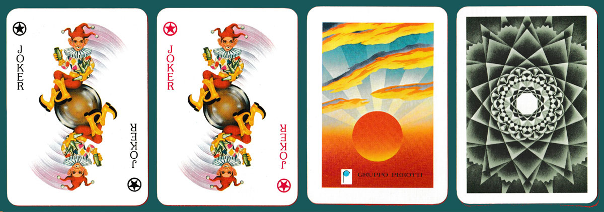Above: Gruppo Perotti playing cards designed by Tiger Tateishi and printed by Masenghini, Bergamo, Italy, 1979. 2 x 52 cards + 2 Jokers + 1 extra card, plus a photograph of the artist in a double box with a flock finish. Size: 64 x 90 mm.