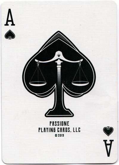 Above: Justice playing cards designed by John Cho and Giordano Loddo, published by Passione Playing Cards, printed by Shenzhen Wangjing Printing Co., Ltd. (WJPCC) in China, 2019. 700 decks only.