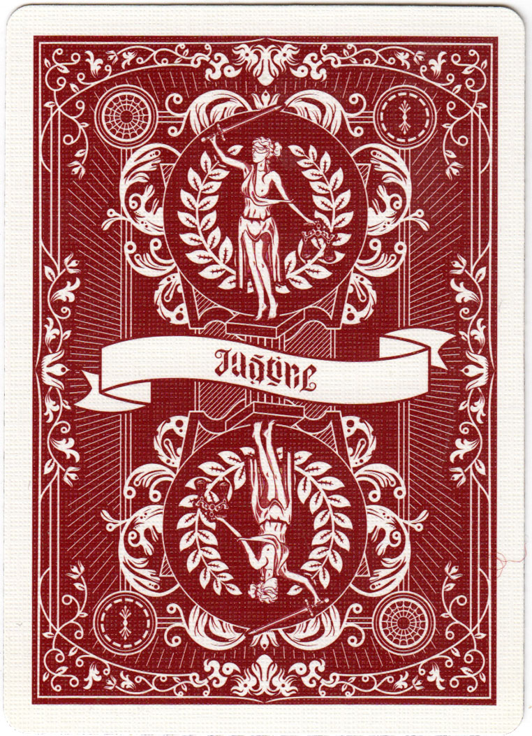 The court cards, by Giordano Loddo for Passione Playing Cards, were designed to be fresh but classic, stylish but usable on every occasion. The Jokers represent the Lady of Justice and were conceived by John Cho. The background to the jokers is the all-seeing sun. The justice theme is also found on the backs, the box and the extra gaff card .
