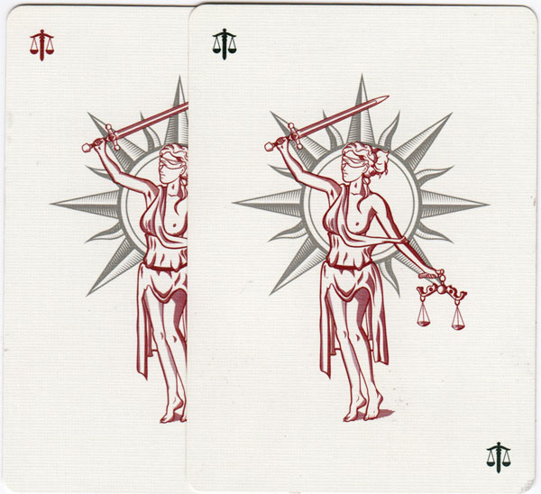 One of these projects was Justice playing cards, which incorporates ethical concepts of rectitude and virtue into a deck aimed at players, magicians and cardists. There were also twin decks titled Equality & Integrity. The ace of spades has the scales of justice motif with the publisher’s name and date.
