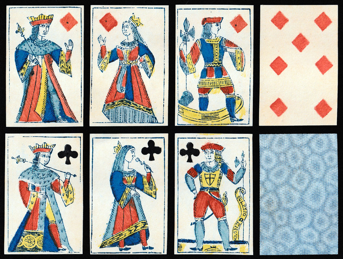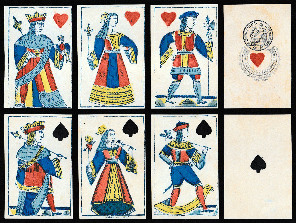 This could well be the last in the line of Lyon pattern packs. Produced by Faustino Solesio of Genoa in about 1870 with colouring applied by stencil, it has some familiar features: the King of Hearts holds a falcon, while the King of Clubs carries a slim sceptre over his shoulder. Other features are lacking: there are no orbs and only two of the queens hold flowers. Attached to the Queen of Spades is a ‘sprouting’ heart pierced by an arrow. There are scrolls or banners on the Jack of Diamonds, the Jack of Spades and the Jack of Clubs, the latter bearing the manufacturer’s name. On the breast of the Jack of Clubs are the arms of Genoa. Above the manufacturer’s name on the Ace of Hearts is the tax stamp (in use from 1863 to 1874). The wrapper has no text other than the maker’s name and “SOPRAFFINE 40.” One is left wondering what the market was for these cards • see the wrapper