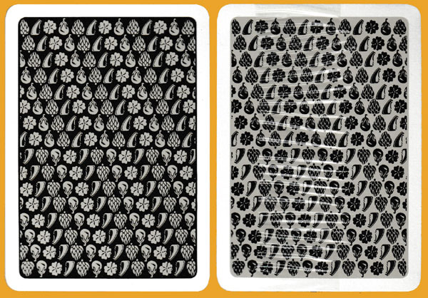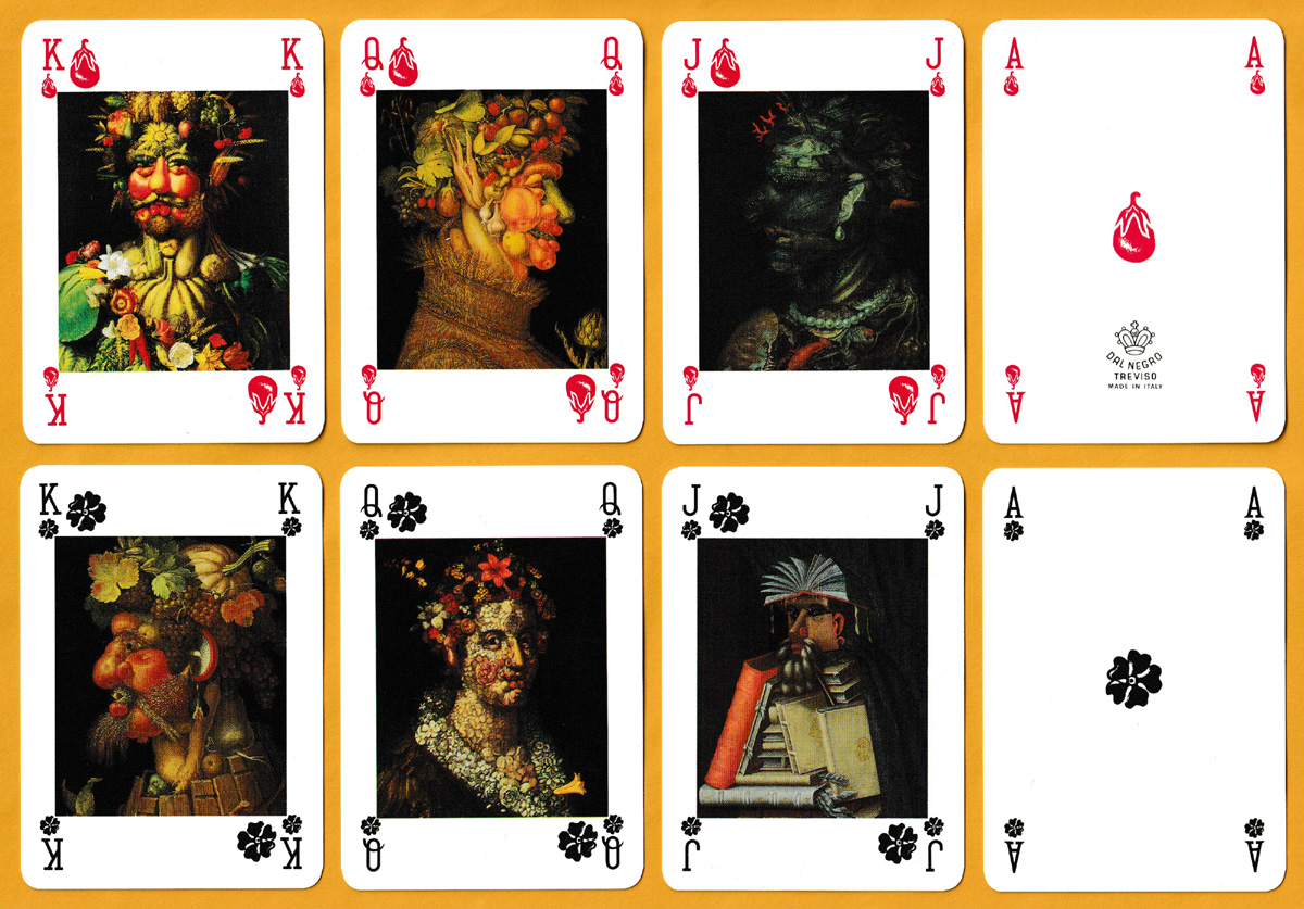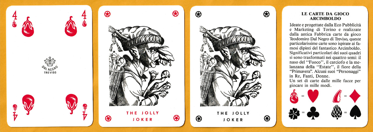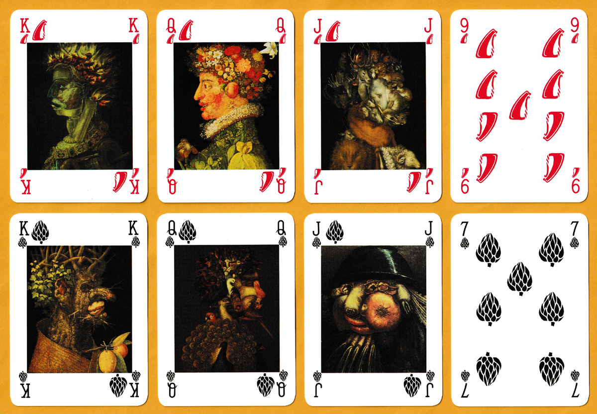 Giuseppe Arcimboldo (1527-1593) was an Italian Renaissance painter best known for his portrait heads made entirely of fruits, vegetables, flowers, fish and books. Twelve of those portraits can be found in full colour on the courts of this pack, with another in black and white on the Jokers. Adding to the fun are the suit-signs: hearts have become aubergines, clubs are flowers, diamonds are noses, and spades have been replaced by artichokes. These four non-standard suit-signs also make up the pattern on the reverse. The idea for the pack came from a publicity agency in Turin called Eco Pubblicità e Marketing.