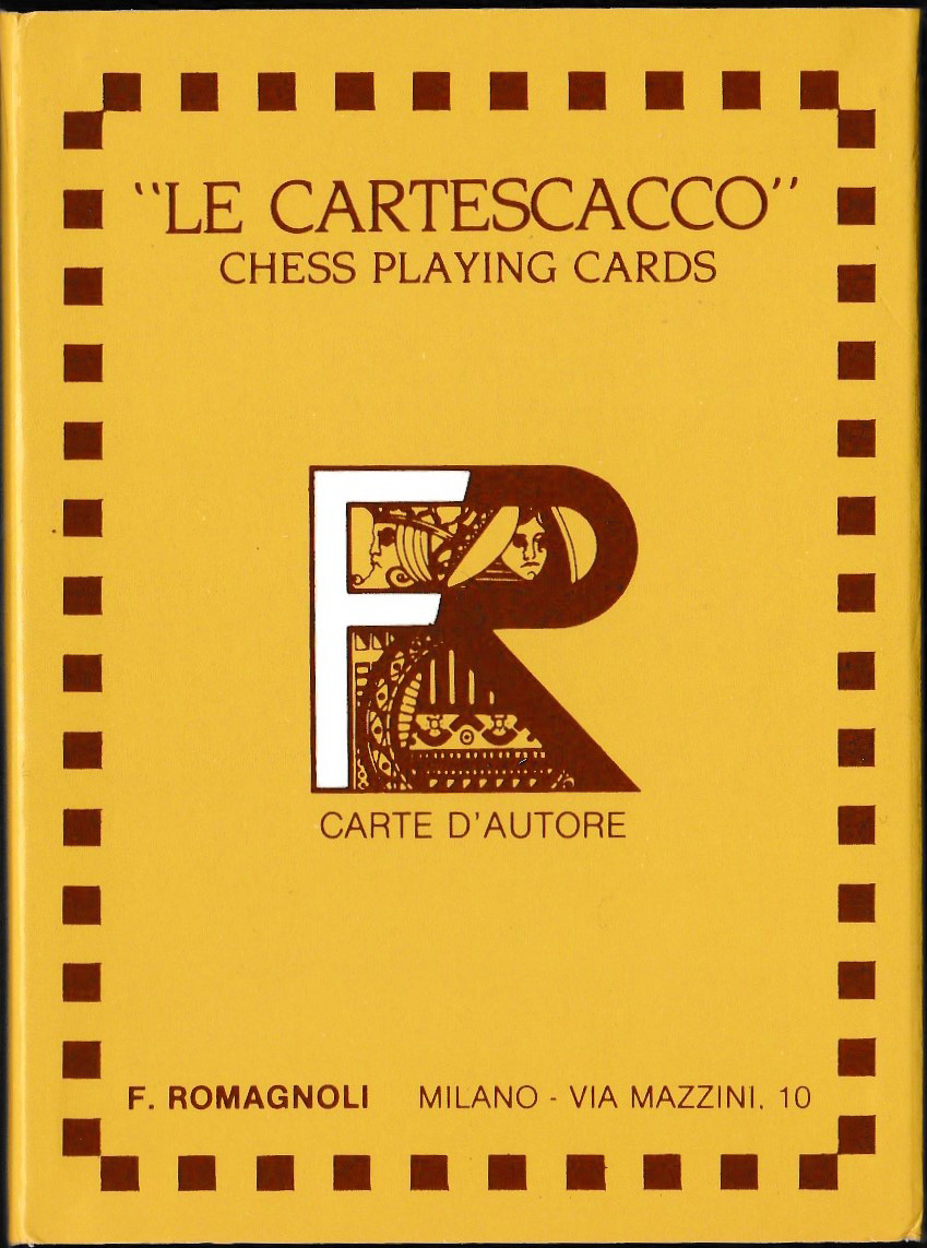 Designed by Franco Romagnoli with the collaboration of M. Chiarenza and A. Reccagni, this pack is intended to bring together and celebrate the two most fascinating games in the world – chess and bridge. It was printed by La Milano c. 1981.