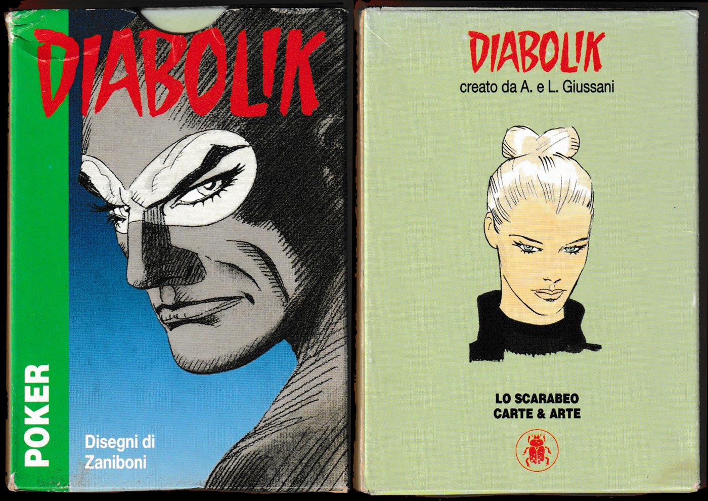 Diabolik was created in 1962 by sisters Angela and Luciana Giussani. It subsequently became one of the most popular series in the history of Italian comics, consisting of more than 900 volumes. Diabolik, the main protagonist, is an anti-heroic thief who, over time, came to focus on robbing and killing other criminals. The comics have been translated into many languages including Serbian, Croatian and Tamil. From 1969 until 2015, Sergio Zaniboni undertook most of the artwork aided by his son, Paolo. They are credited with the designs for this pack. In 1993, a set of major arcana called “Diabolik – I Tarocchi Neri” was also produced. See the box►