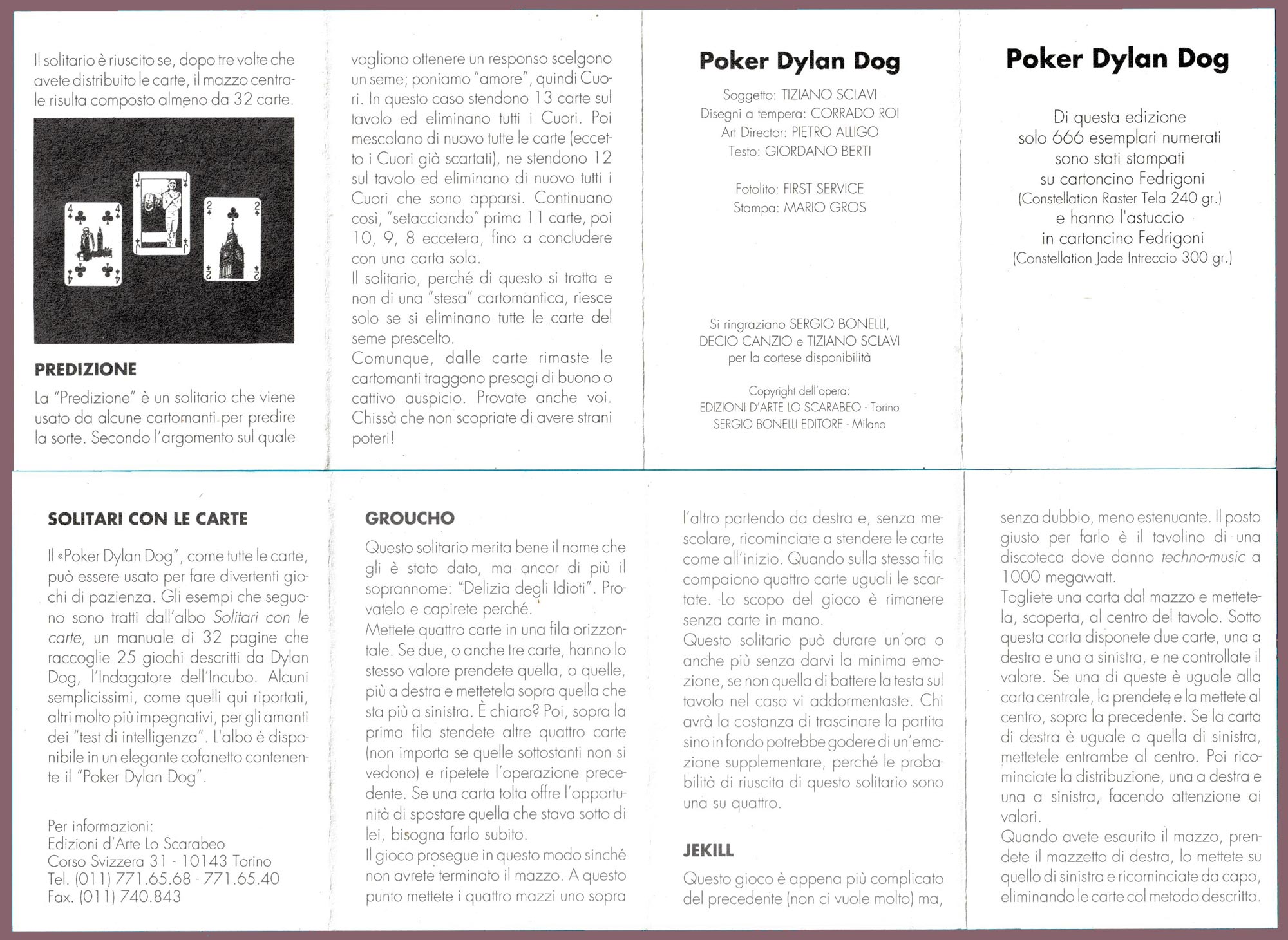 Dylan Dog is the second most widely sold comic book in Italy, published by Sergio Bonelli Editore of Milan. It first appeared in 1986. Dylan Dog is a paranormal investigator who takes on cases involving supernatural elements. The character was named for the Welsh poet Dylan Thomas. The series is set mainly in London. The court cards feature some of the main characters from the series written by Tiziano Sciavi and drawn by Corrado Roi. Dylan himself appears on the Ace and King of Hearts. On the numeral cards there are small vignettes in purple with additional characters, objects and scenes from the stories. Dylan’s trusty sidekick Groucho (a Groucho Marx lookalike) is featured on the two Jokers. The leaflet has instructions in Italian for three patience games. See the box