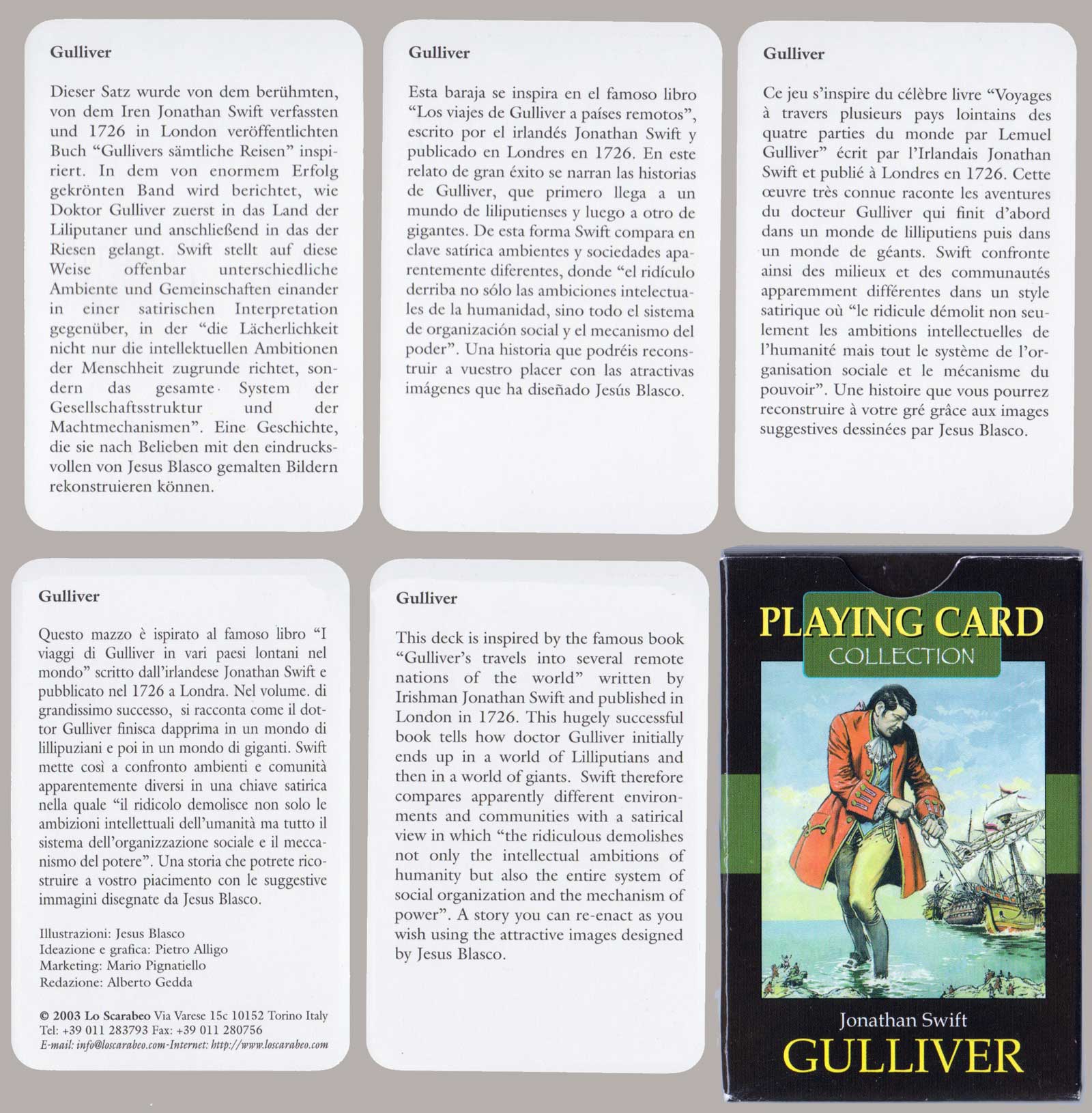 The artwork in this deck of cards is by Jesus Blasco, inspired by the famous book Gulliver‘s Travels written by the Irishman Jonathan Swift in 1726, and published here by Lo Scarabeo, Torino, Italy, 2003. See the information cards►