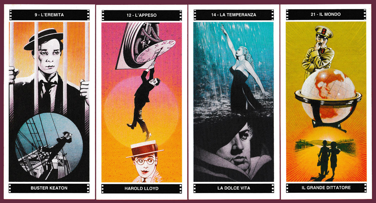 A set of Tarot trumps on the subject of the cinema, with designs by Sergio Sarri.
