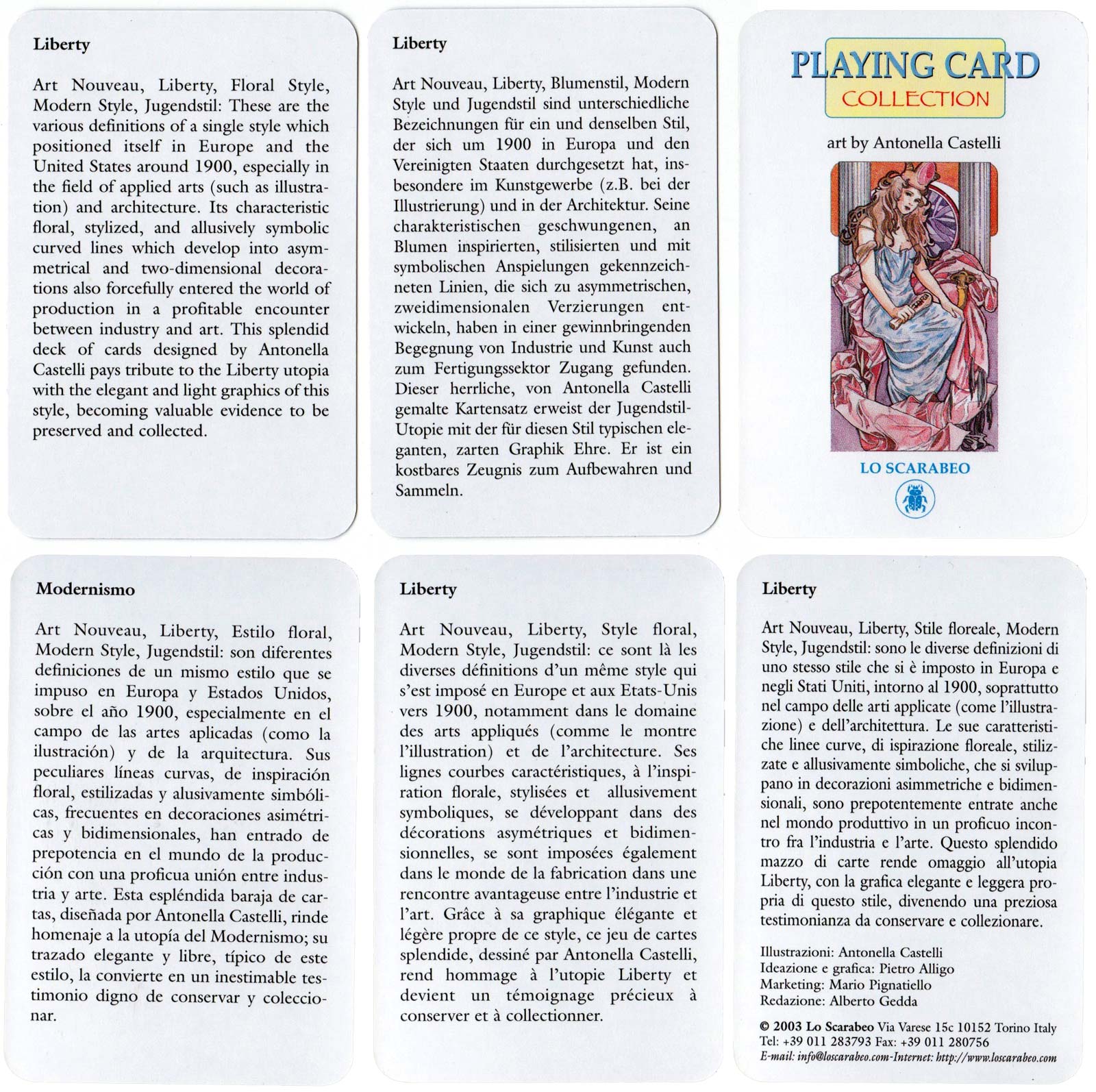 Liberty playing cards with gentle ‘Art Nouveau’ illustrations by Antonella Castelli, a miniature work of art, published by Lo Scarabeo, 2003. Lo Scarabeo certainly know how to present a pack of cards. It’s wonderful to have all the pack described and dated in several languages on the extra cards►.