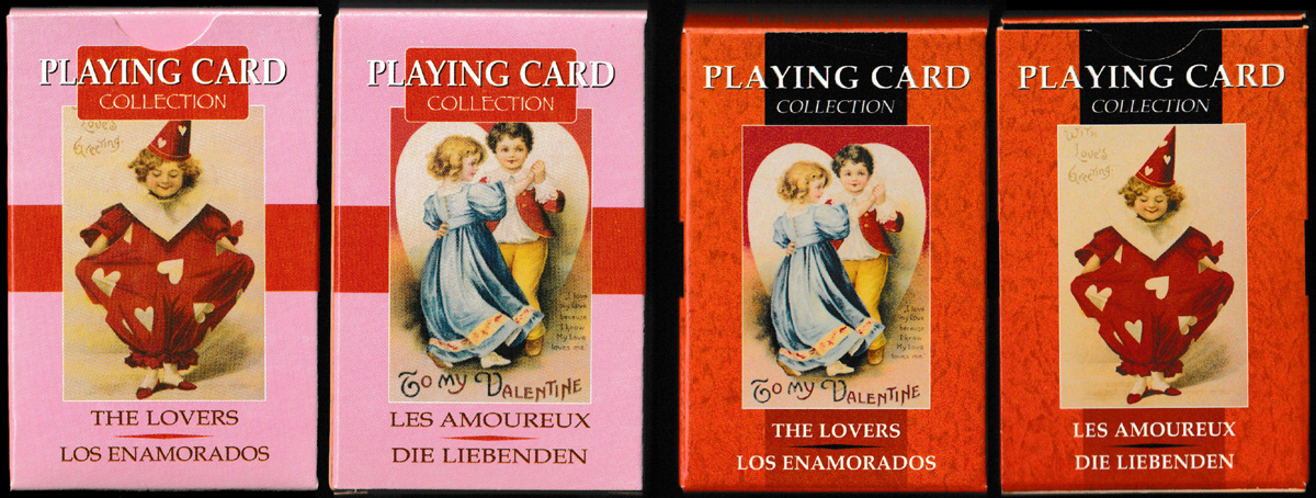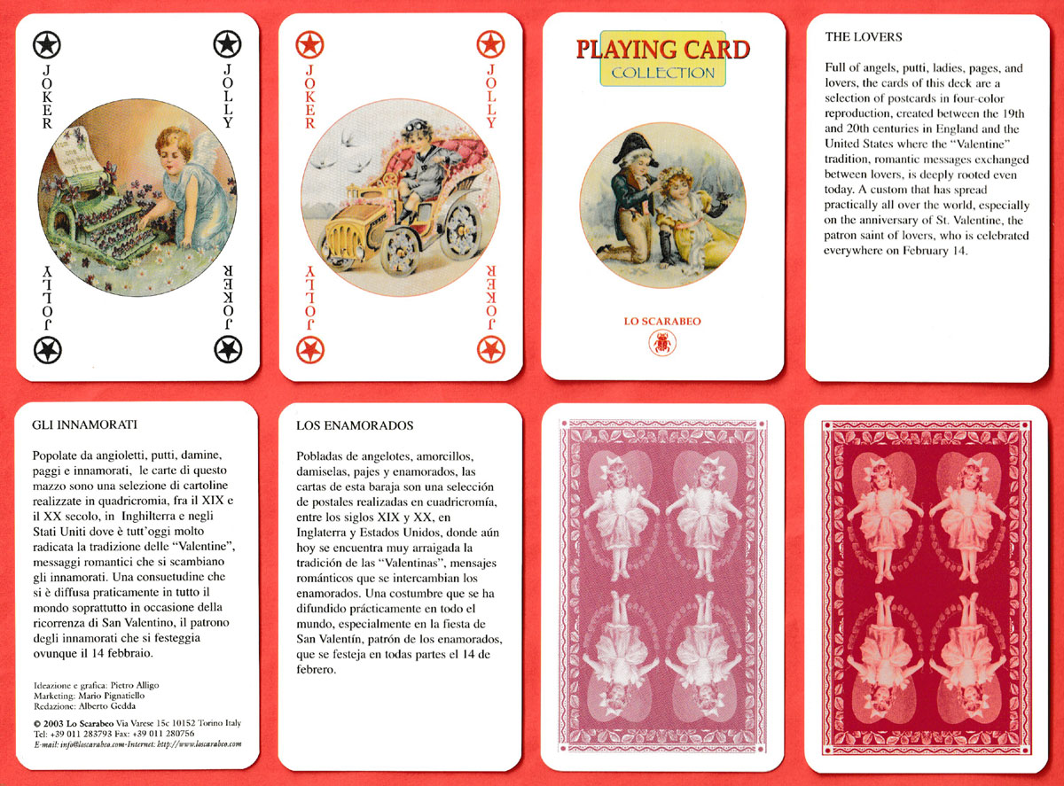 Above: The Lovers playing cards published by Lo Scarabeo, Turin, Italy, 2003. 52 cards + 2 Jokers + 1 title card + 5 extra cards with explanatory text in English, Italian, Spanish, French and German, in tuck box. Size: 58 x 88 mm. © 2003 Lo Scarabeo