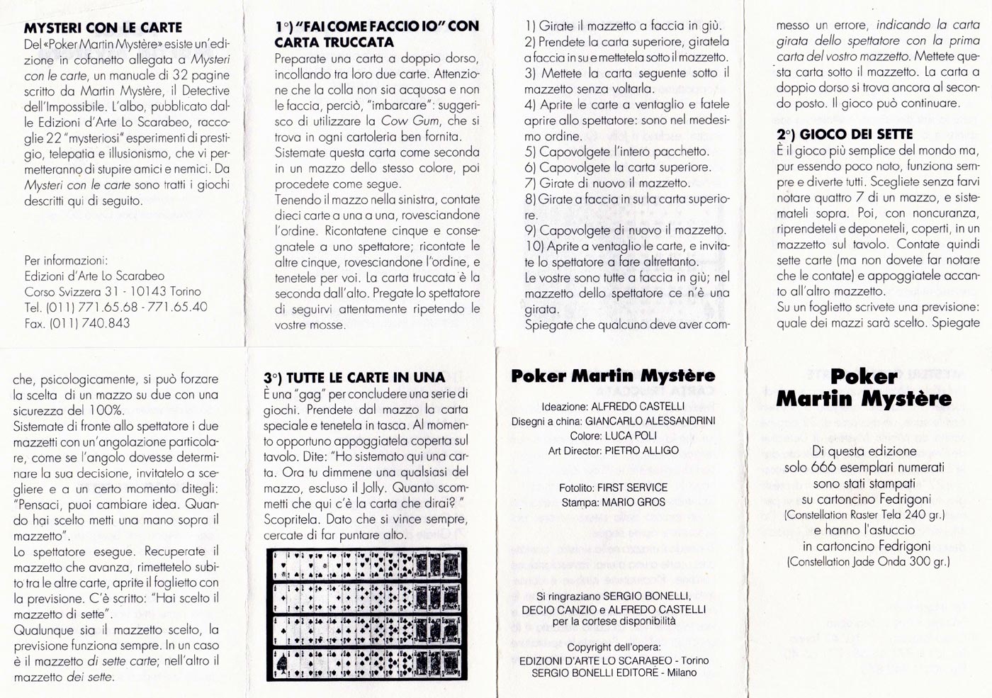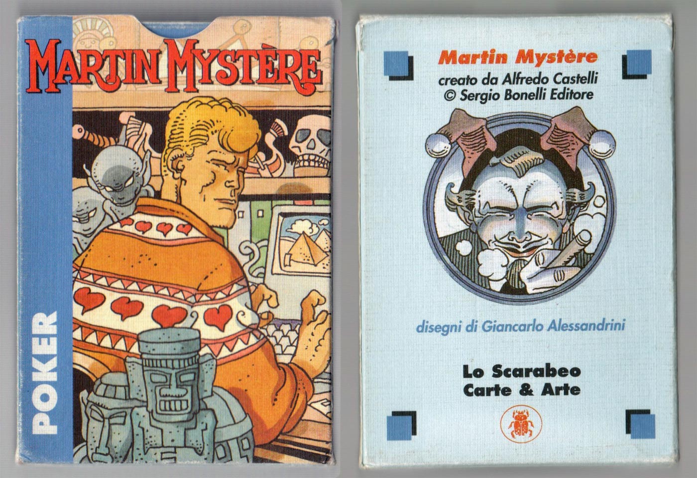 Above: Martin Mystère poker published by Lo Scarabeo, Torino, Italy. 52 cards + 2 jokers + leaflet + extra card in box, c.1995. The leaflet explains that 666 numbered packs were printed on a particular kind of board and came in boxes made of a similar, slightly heavier board. The whole edition must have been much greater.
