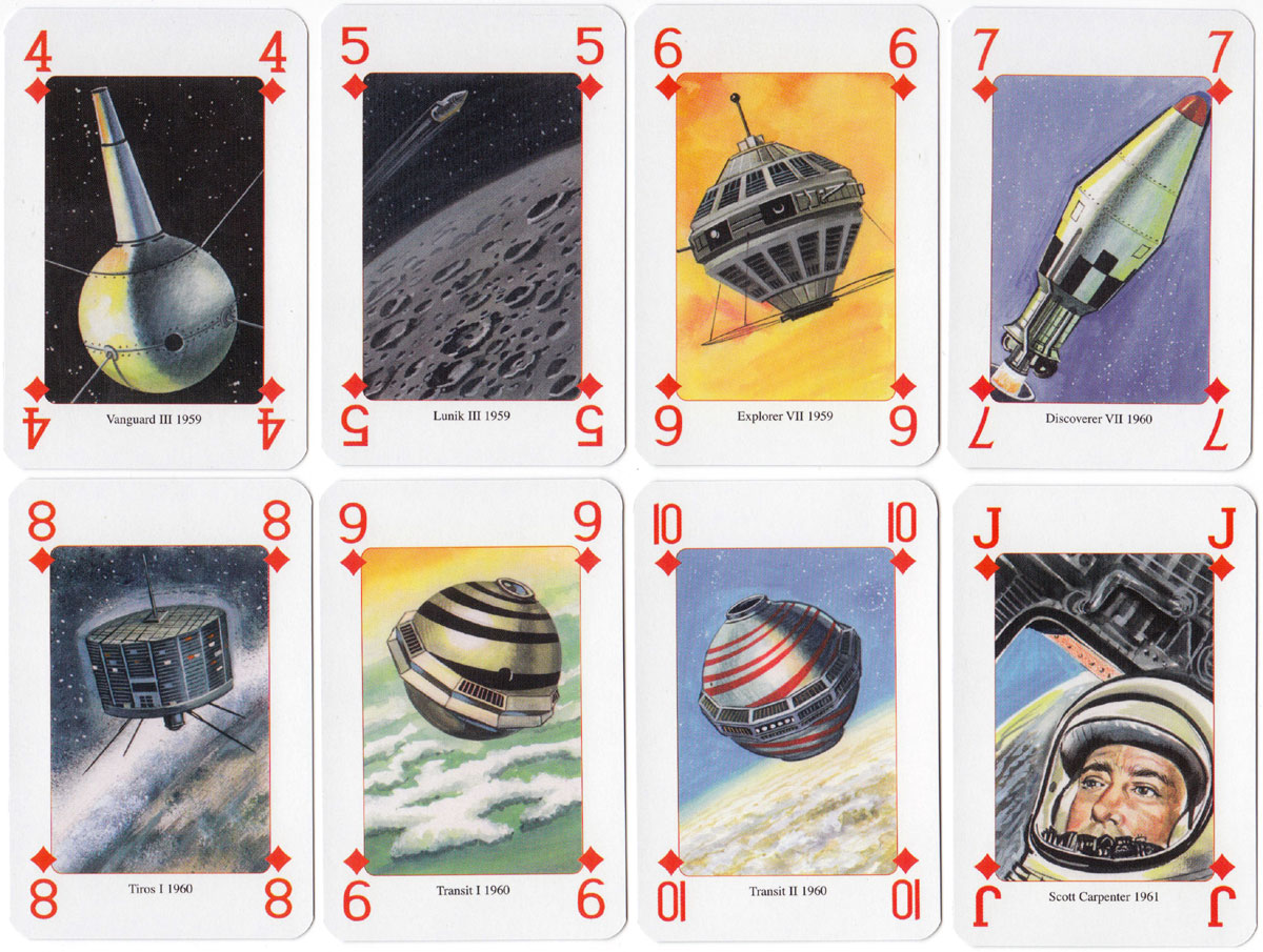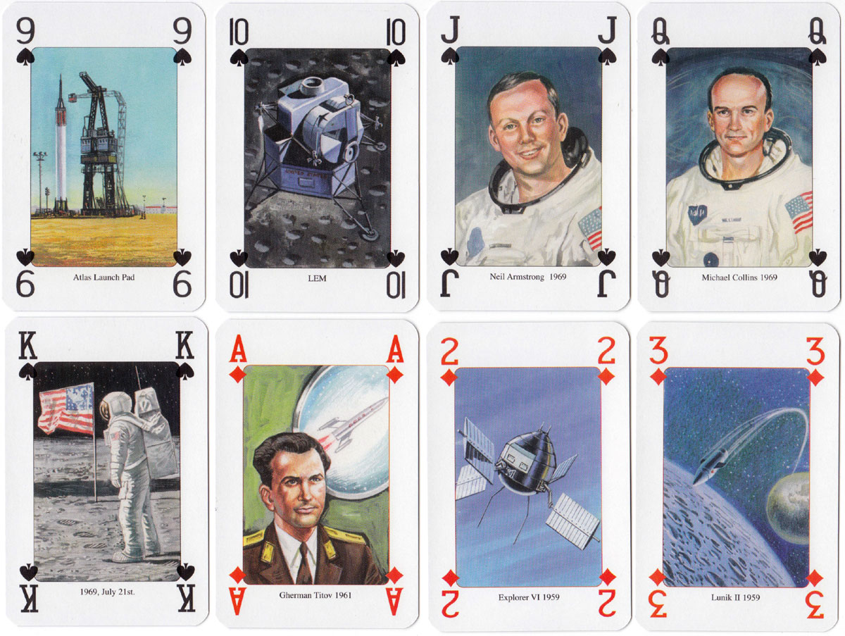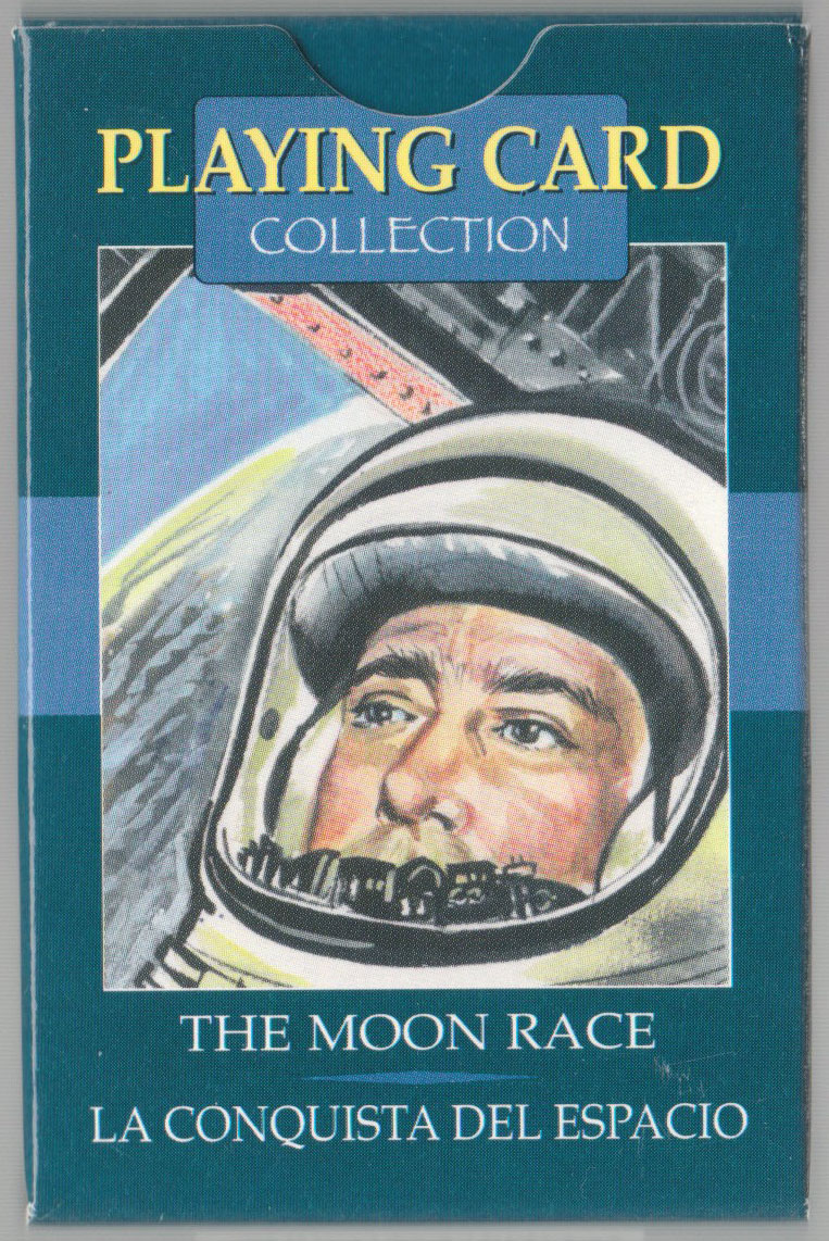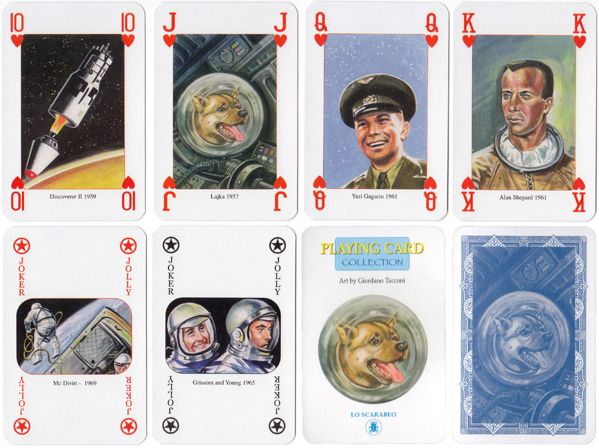 Above: ‘Moon Race’ playing cards published by Lo Scarabeo, Via Varese 15c, 10152 Torino Italy, 2004. Illustrations by Giordano Tacconi. 52 + 2J + 3 extra cards in tuck box.