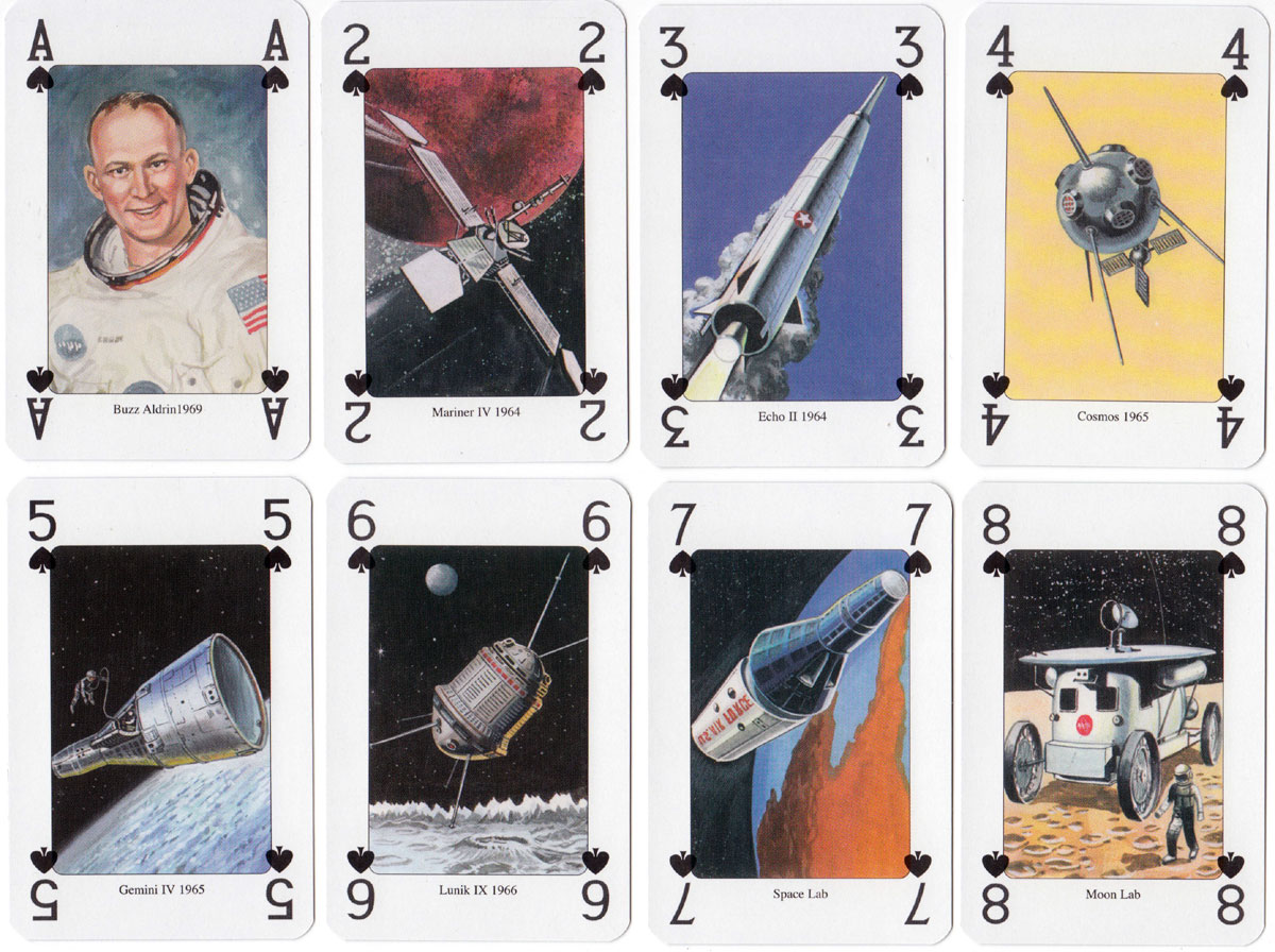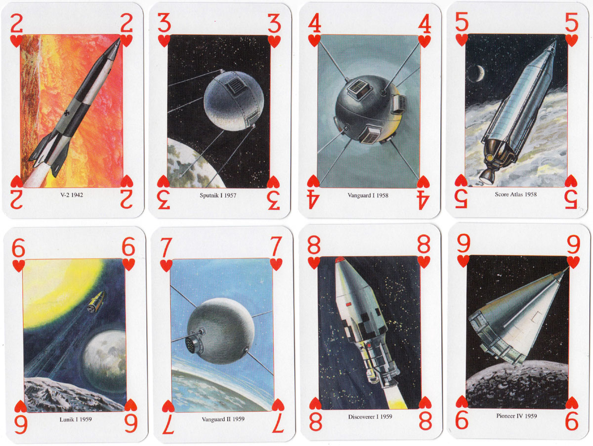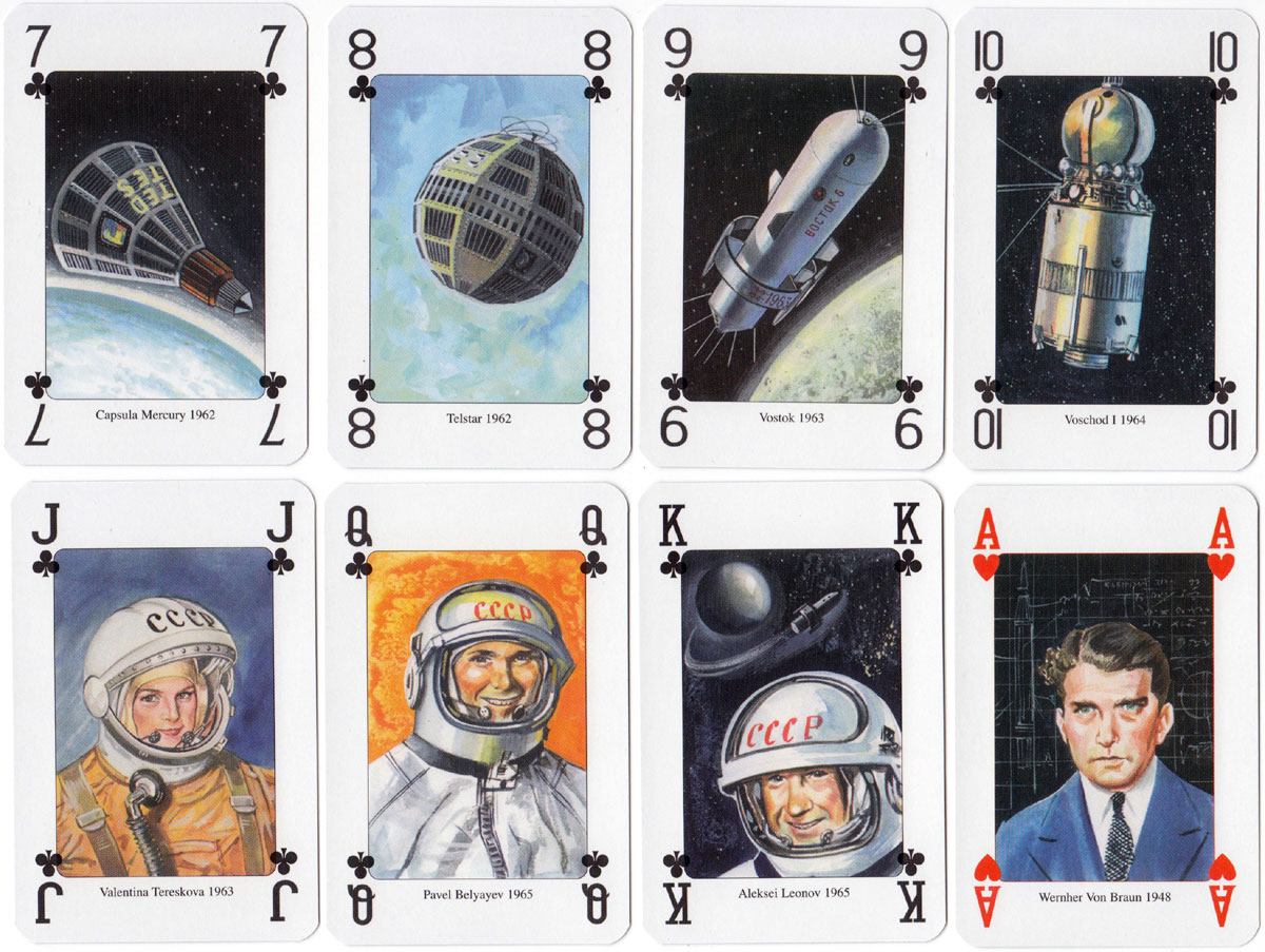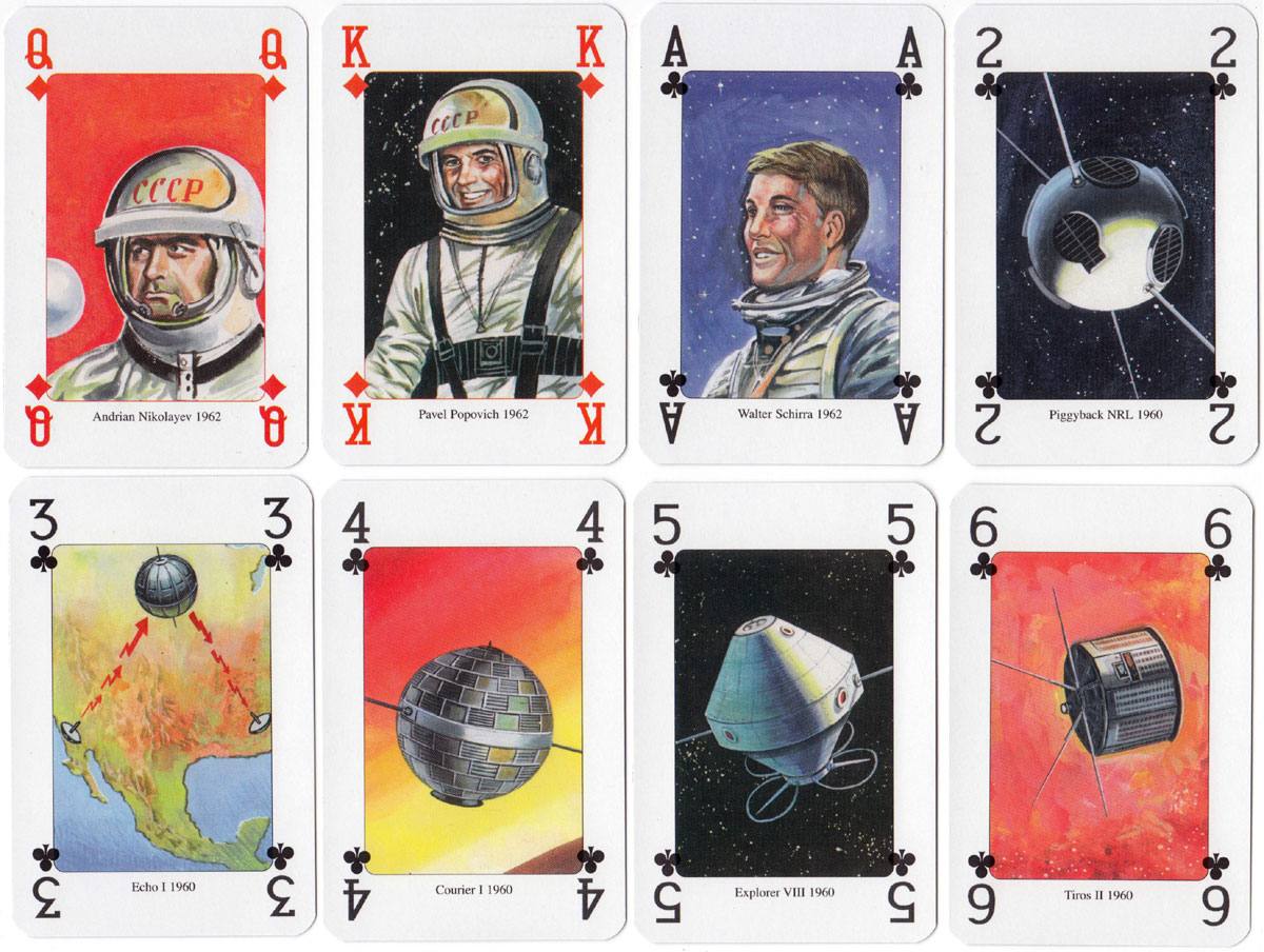 Above: ‘Moon Race’ playing cards published by Lo Scarabeo, Via Varese 15c, 10152 Torino Italy, 2004. Illustrations by Giordano Tacconi. 52 + 2J + 3 extra cards in tuck box.