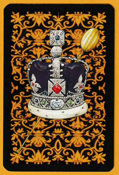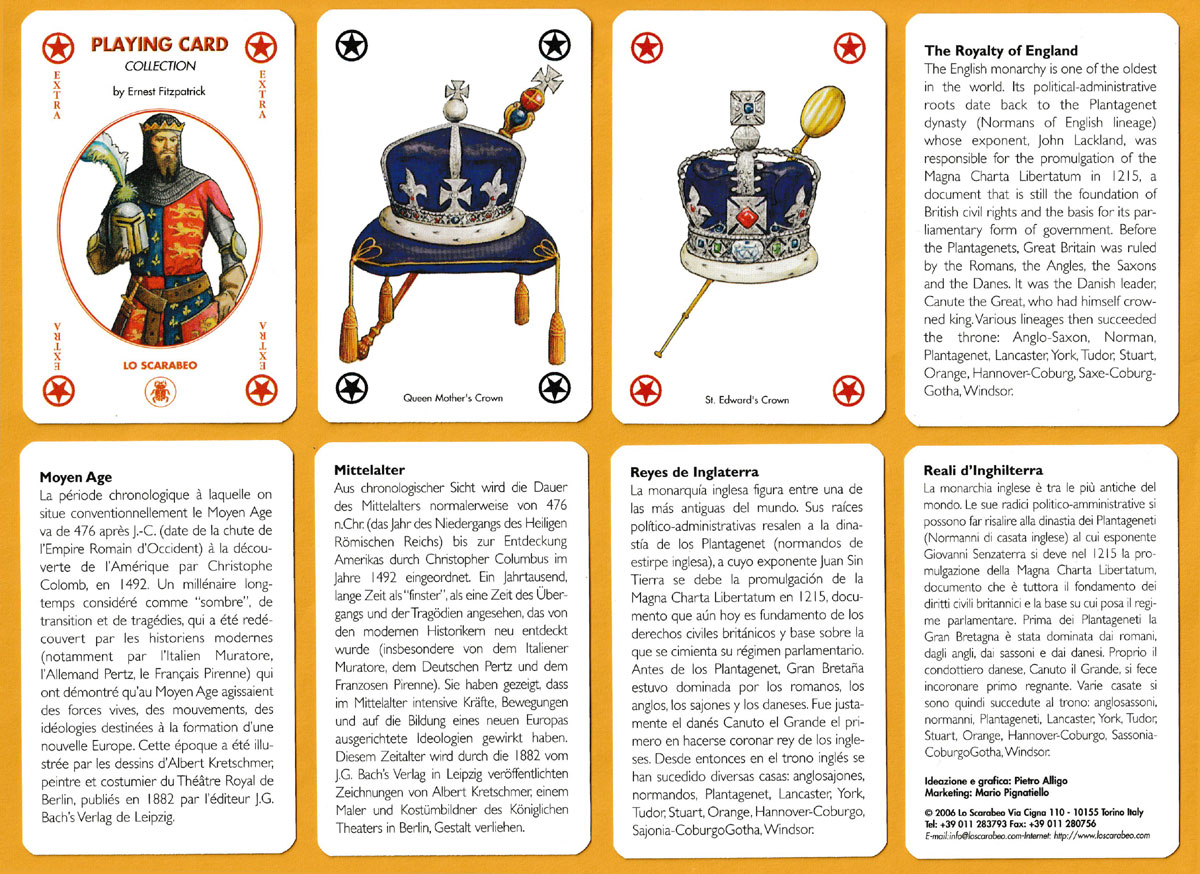 Above: Royal Britain playing cards published by Lo Scarabeo, Turin, Italy, 2006. 52 cards + 3 Jokers + 5 extra cards with text in Italian, English, French, German and Spanish, in tuck box. Size: 58 x 88 mm. © 2006 Lo Scarabeo