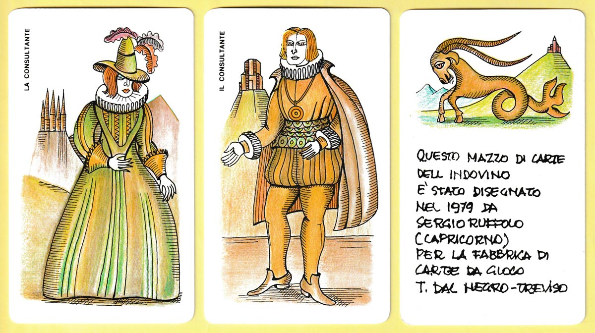 Sergio Ruffolo (1916-1989) was an Italian designer, painter and sculptor. He created several sets of playing cards as well as a pack of Tarot cards, the Tarocco Indovino. That Tarot pack included 52 of the designs found in this fortune-telling pack. The figures wear medieval garb but are drawn in a distinctive, modern style using relatively soft colours. The card meaning is given top left, upright and reversed, in Italian. The card value and suit are shown top right. In addition, the cards are numbered 1 to 52 bottom left. There are two consultant cards, one male and one female, and one double-backed card. The back design features all 12 signs of the Zodiac against a pale blue background. The same back design was used on the Tarot cards but with a different background colour. See the box►