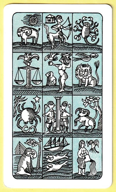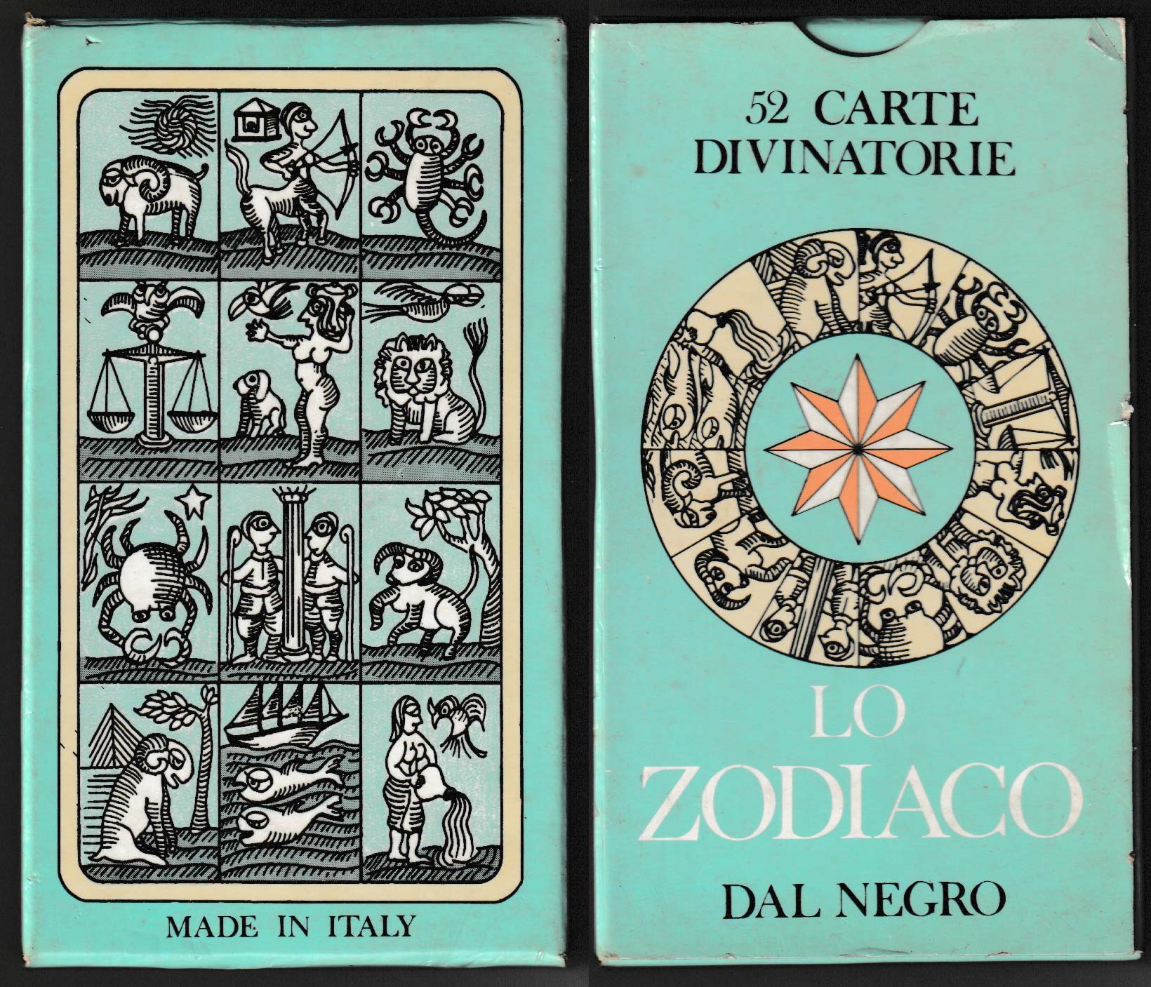 Above: Lo Zodiaco fortune-telling pack designed by Sergio Ruffolo and manufactured by Dal Negro, Treviso, Italy, 1979. 52 cards + 2 ‘consultant’ cards + 1 double-backed card + 1 title card + 36-page booklet in Italian, in tuck box. Size: 62 x 106 mm.
