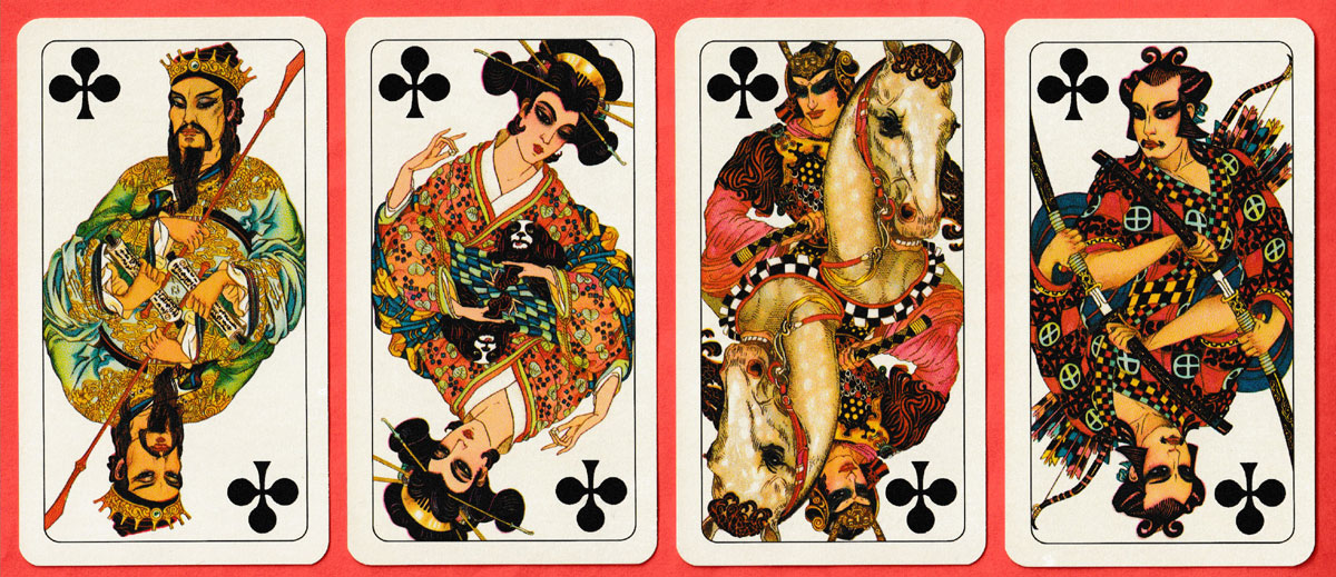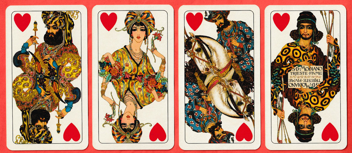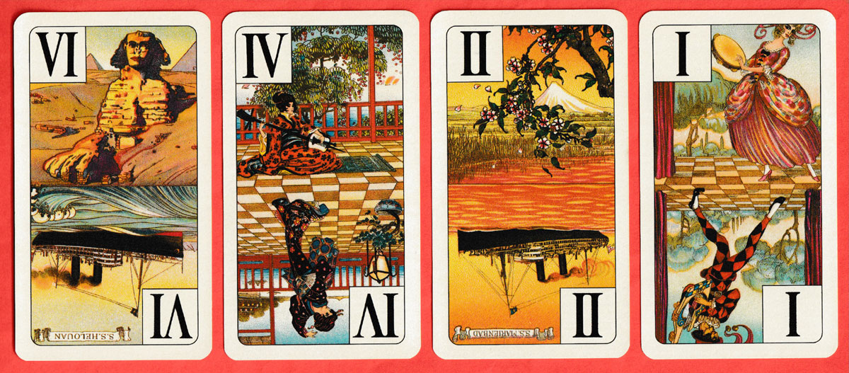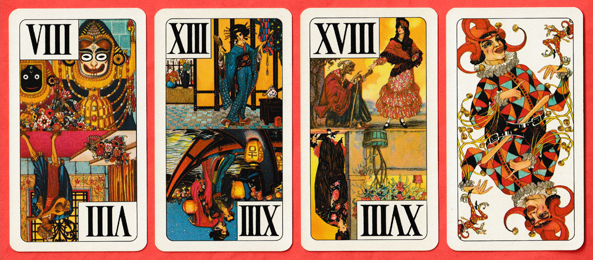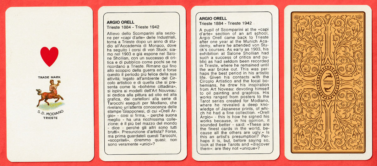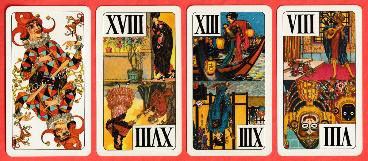 The artist who designed these cards, Argio Orell (1884-1942), apparently said of them, “These are the finest cards in the world, because all the others are ugly”. It is difficult to argue with that statement when one looks at the colours, the detail, and the context in which they were created. The original designs date from about 1914 and are in the late Art Nouveau style (called “Floreale” or “Liberty” in Italy). The courts are decidedly exotic and extremely stylish, as are the double-ended trumps. Together they represent the native peoples and places where the ships of the Austrian Lloyd company used to call. Orell particularly appreciated Japanese art and culture, both of which are strongly represented here. Further details about the artist can be found on the extra cards (one in Italian, one in English). The reverse no longer carries publicity for the shipping line • See the box