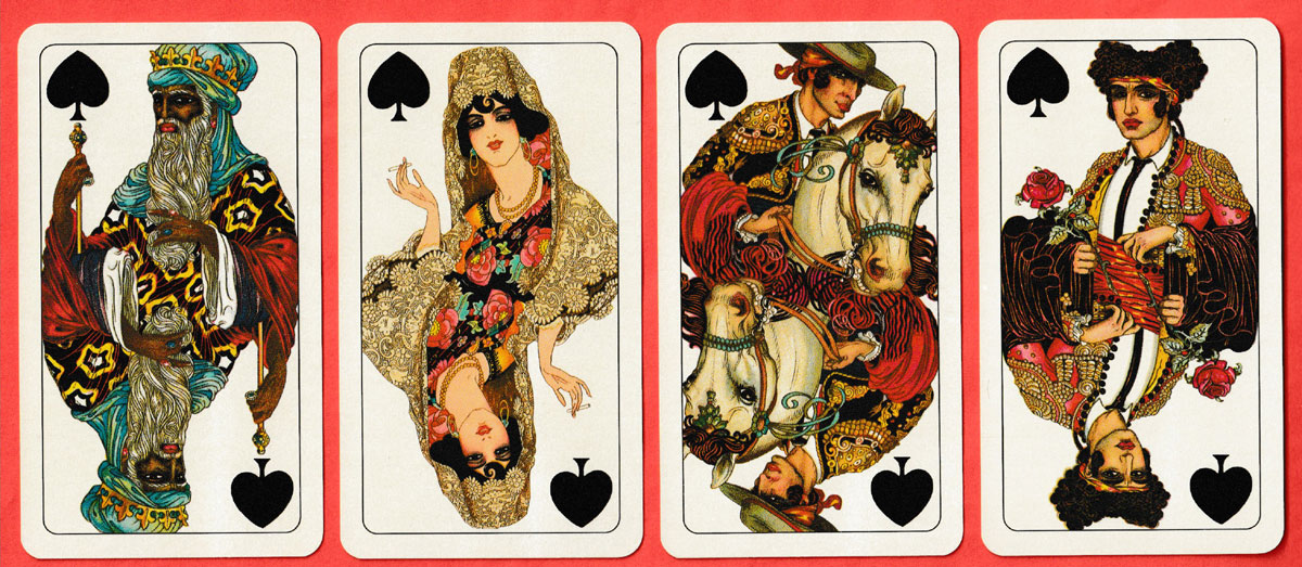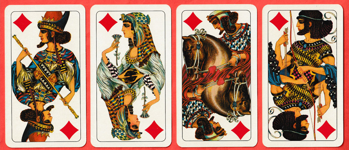 The court cards, minus the cavaliers, were later reduced in size to create a bridge pack generally known as “World Bridge”►