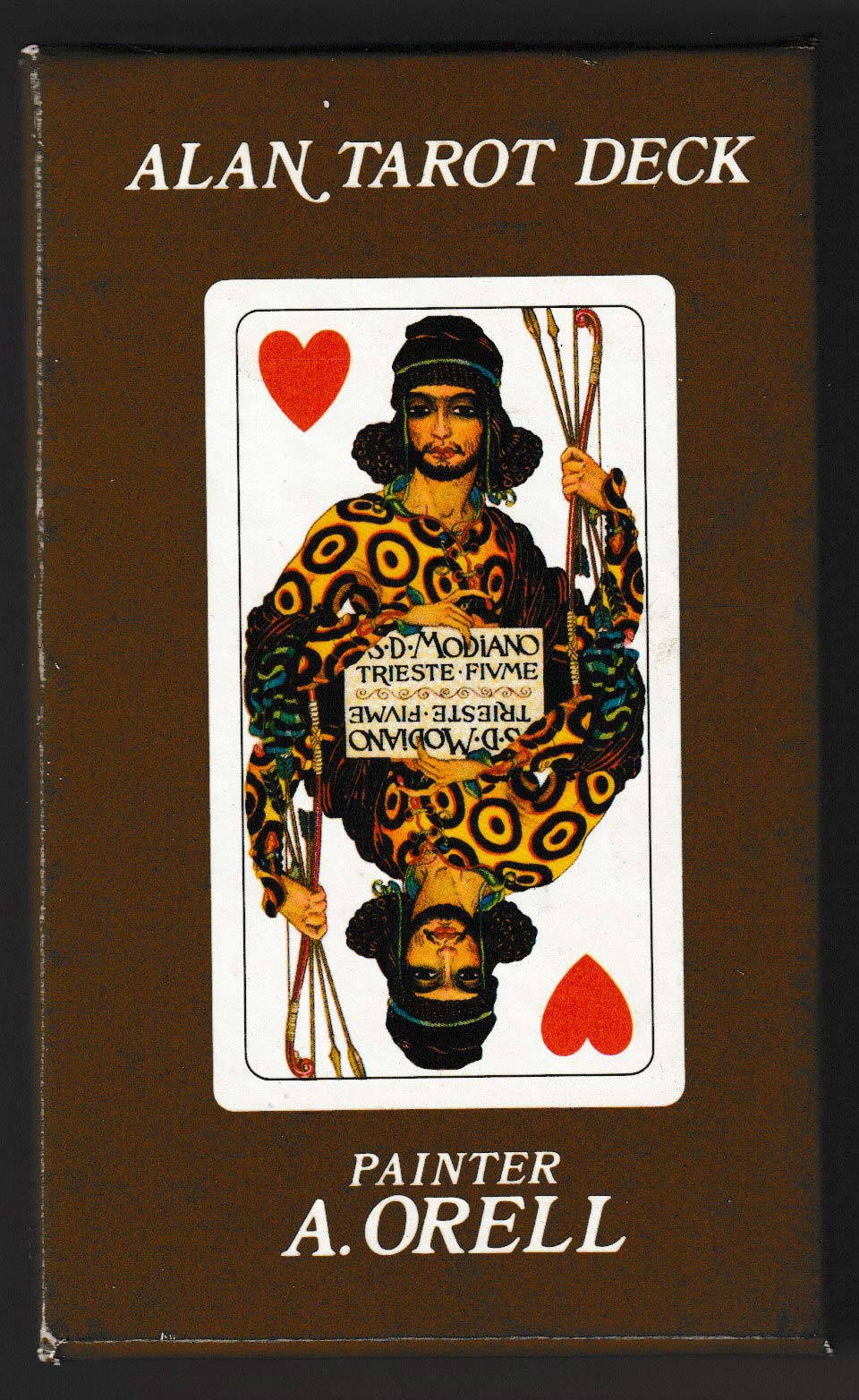Above: Alan Tarot Deck designed by Argio Orell and made by Modiano, Trieste, Italy, 1981. 78 cards + 2 extra cards + 48-page booklet in English, in drop-lid box. Size: 62 x 100 mm.
