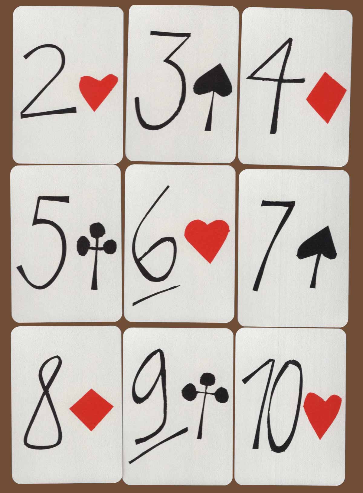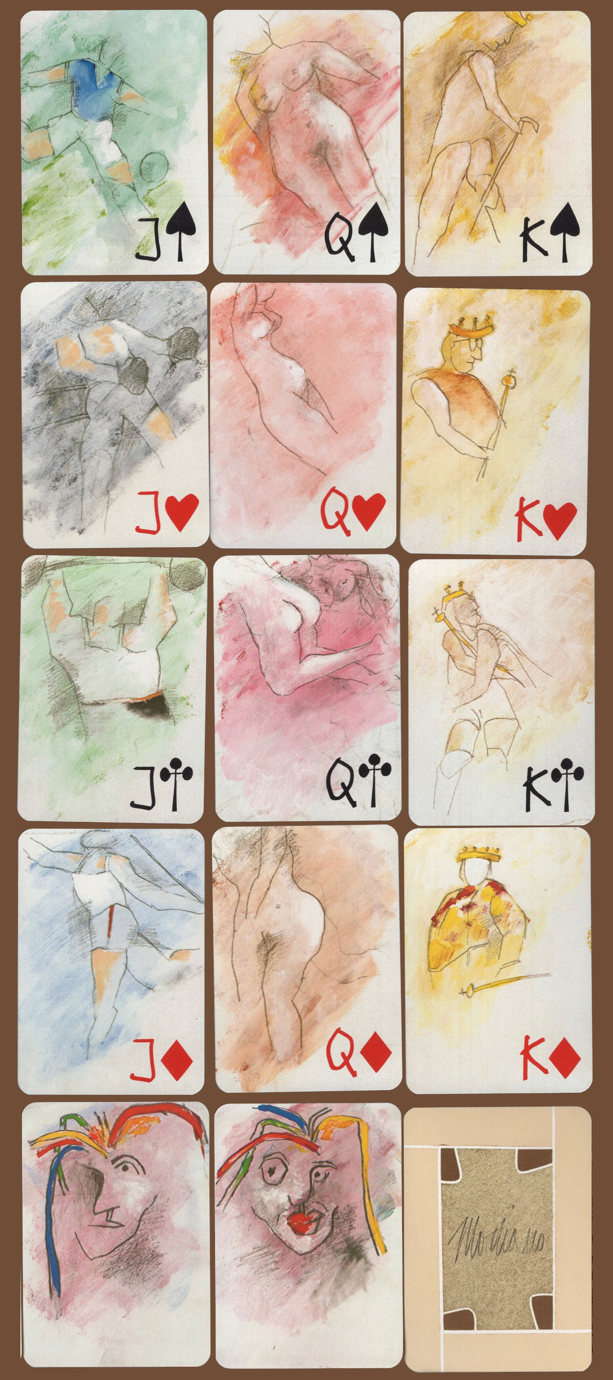 Above: Emilio Tadini playing cards produced by Modiano, c.1982. 52 cards, plus 2 Jokers in box; 89mm x 62mm ; limited edition set of 1000 numbered and signed by the artist.