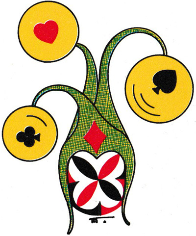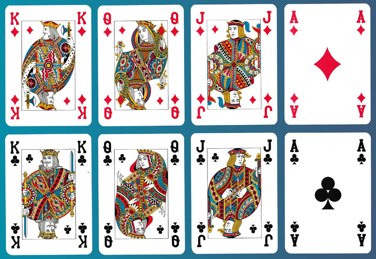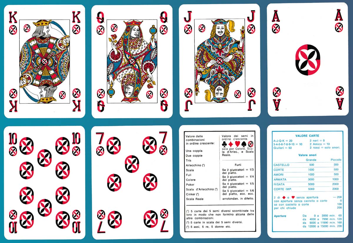 One tends to think of five-suit packs as coming mainly from the USA and Great Britain. However, five-suit packs have been produced elsewhere, including this one from Italy. The fifth suit is called “amici” (“friends”) and is bicoloured (red and black combined). The name “amici” was chosen because a card of the “amici” suit can sometimes act like a Joker and can be a substitute for another card, thus lending a hand in the way a true friend (or “amico”) would do. To give unity to the court cards, the standard English pattern courts have been redesigned, with the courts of the “amici” suit being in a similar style and in a similar range of colours. The extensive booklet in Italian contains the rules for 16 different card games... more►