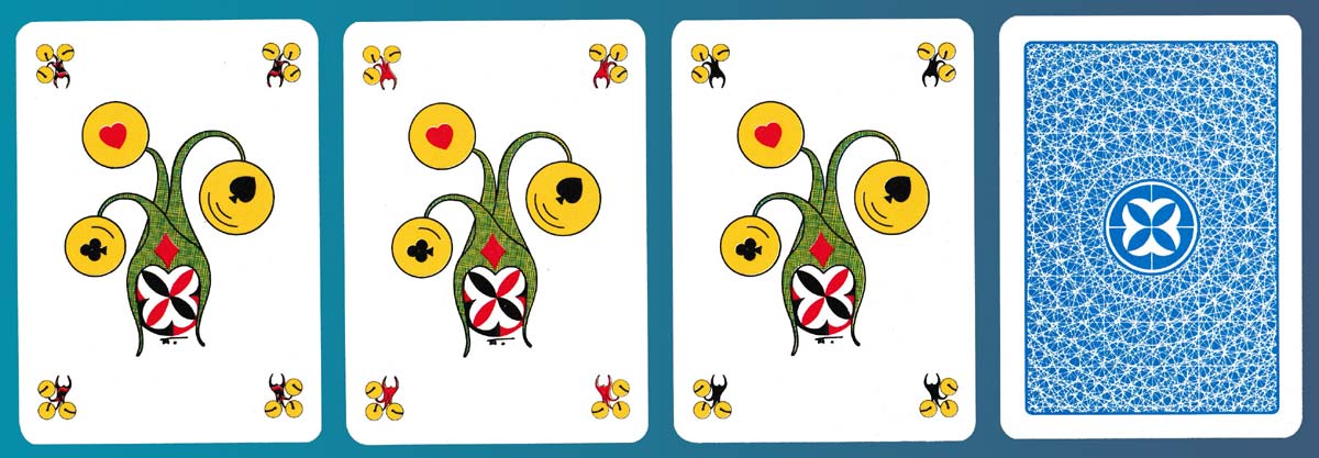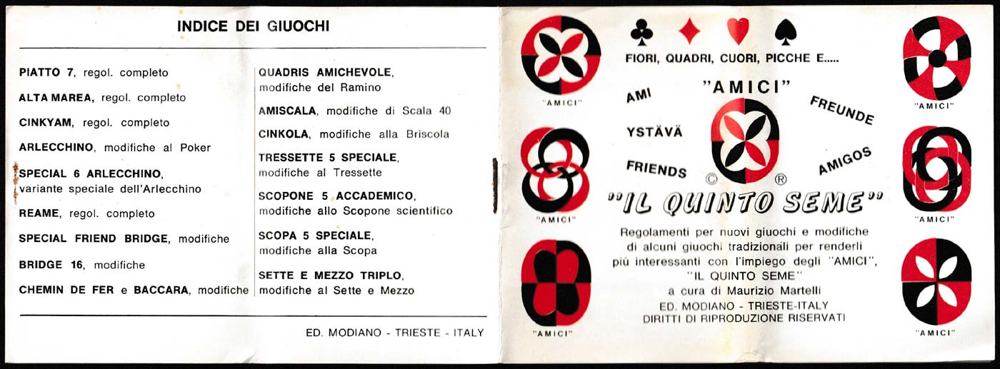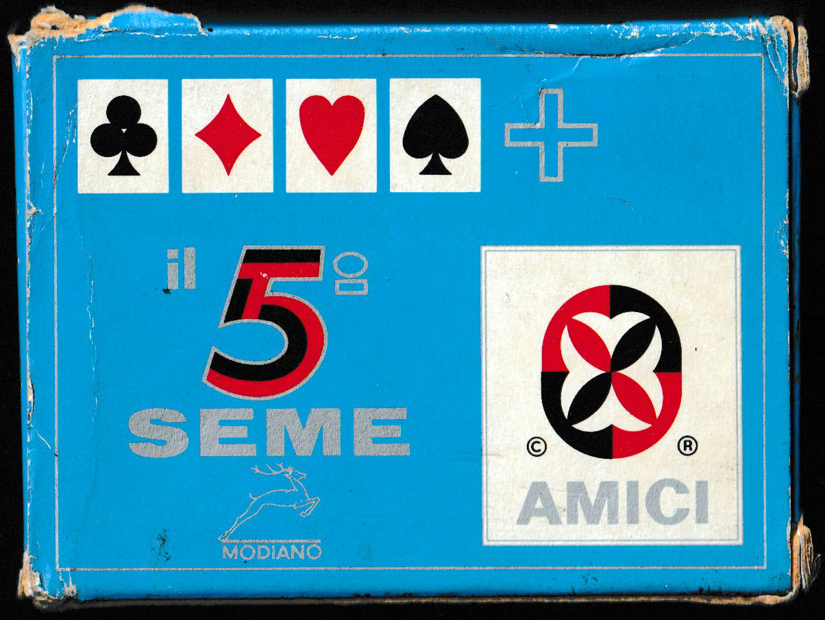 Above: “Il Quinto Seme” five-suit playing cards made by Modiano, Trieste, Italy, 1977. 65 cards + 3 Jokers + 2 score cards + booklet of rules, in tuck box. Size: 63 x 88 mm.