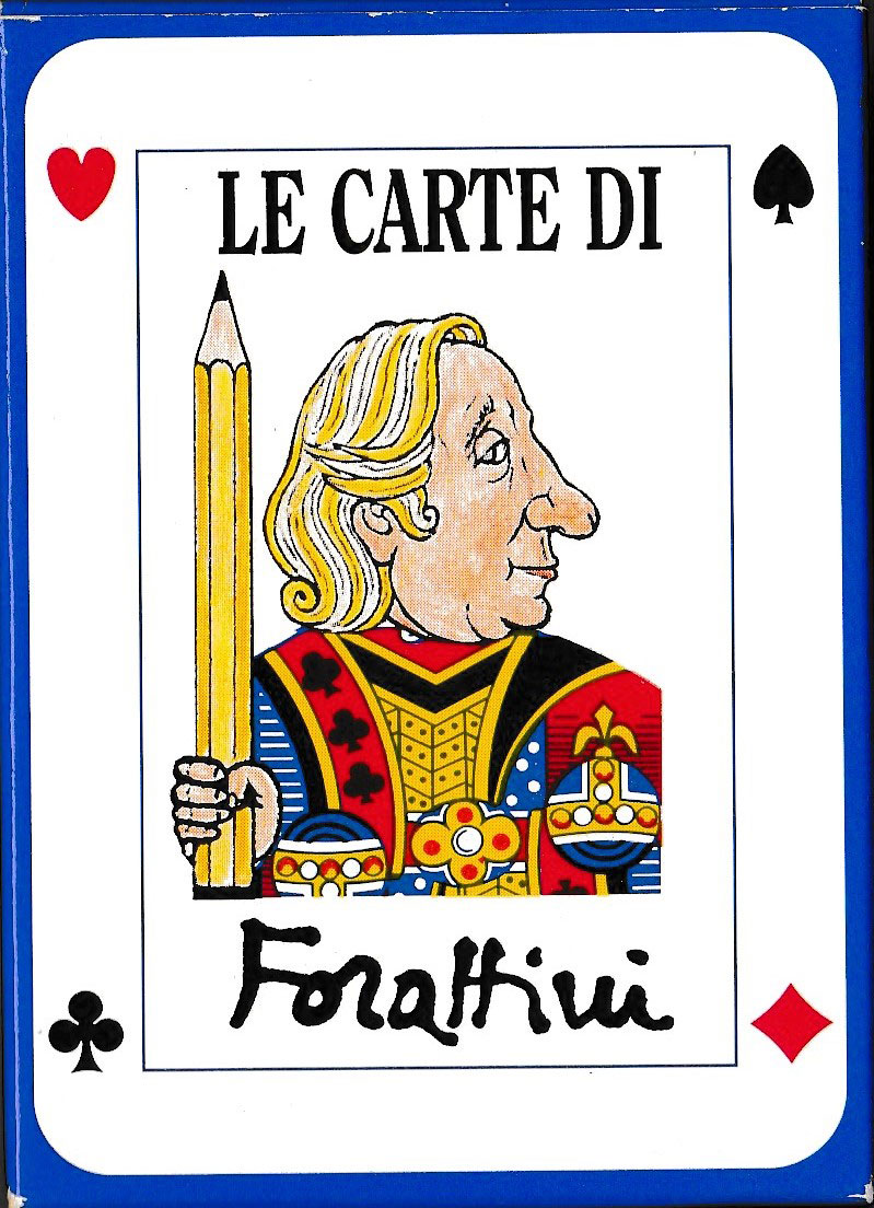 Forattini (b. 1931) is an Italian editorial cartoonist, caricaturist and illustrator, and according to Wikipedia comments "with a corrosive and irreverent humor, the events of Italian and international political life". This is certainly apparent in this political pack which depicts, in an unflattering light, the leading Italian political figures of the day, including Francesco Cossiga (President of Italy, 1985-1992), Gianni Agnelli, Oscar Luigi Scalfaro (President of Italy, 1992-1999), Giulio Andreotti (Prime Minister, 1989-1992), Giovanni Spadolini (President of the Senate 1987-1994), and many others. There are two “Jolly Jokers” and one extra card with Forattini’s signature. The back of the card confirms the pack’s commission from Panorama. The caricature on the box is of the artist himself - Forattini - brandishing a large pencil