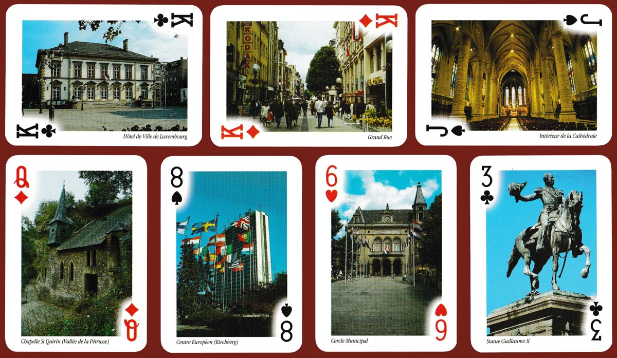 Luxembourg may not be everyone’s first choice as a holiday destination but clearly there are enough visitors to warrant producing souvenir playing cards. This pack by Modiano features 54 different colour photographs, mainly of sights in the city of Luxembourg (one of the four official capitals of the European Union), each one named in French beneath. Both vertical and horizontal formats have been used. On the reverse is the flag of Luxembourg against a cloudless blue sky. If the pack is ever reprinted, the image on the 8 of Spades will need to be changed! See the box►