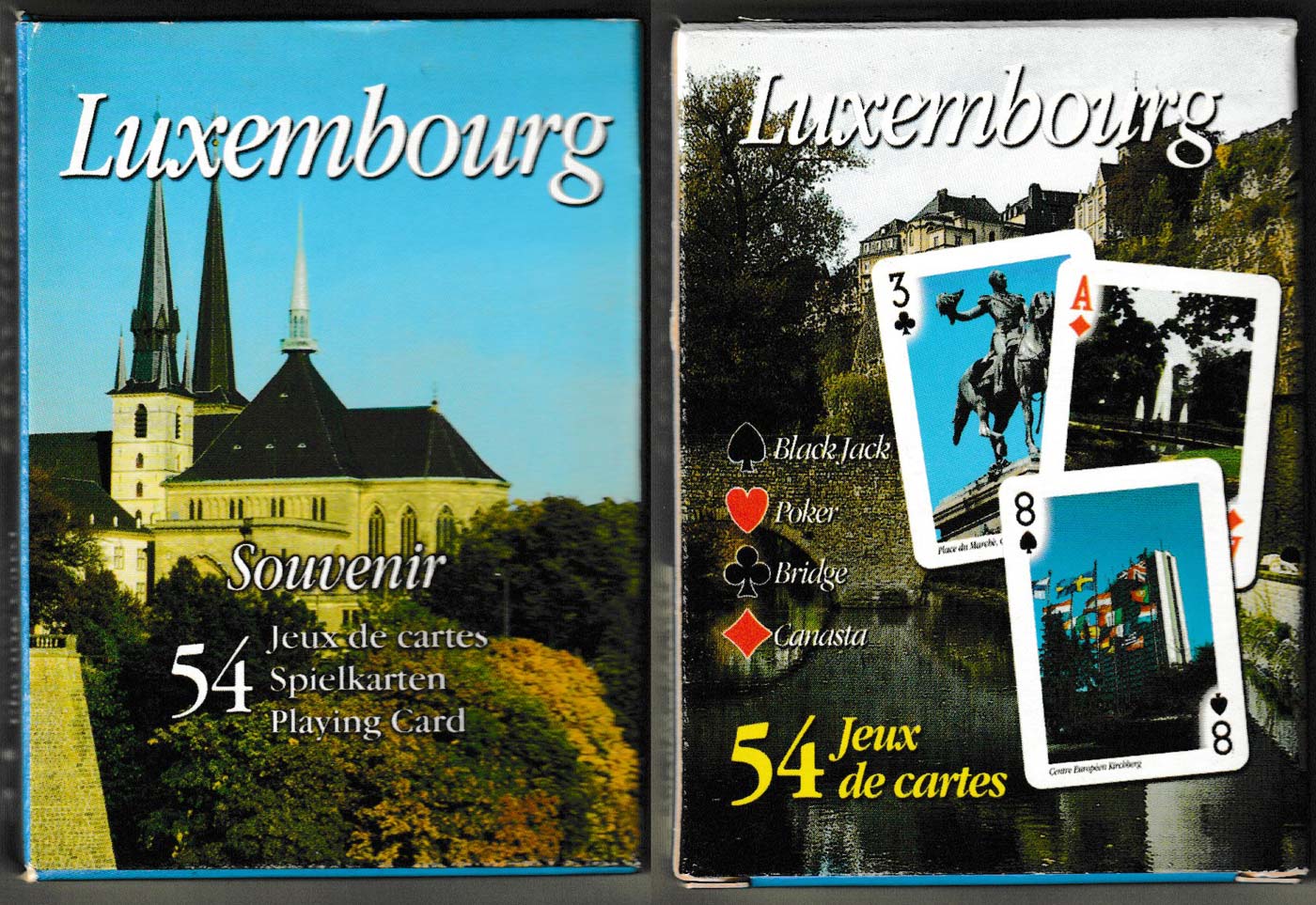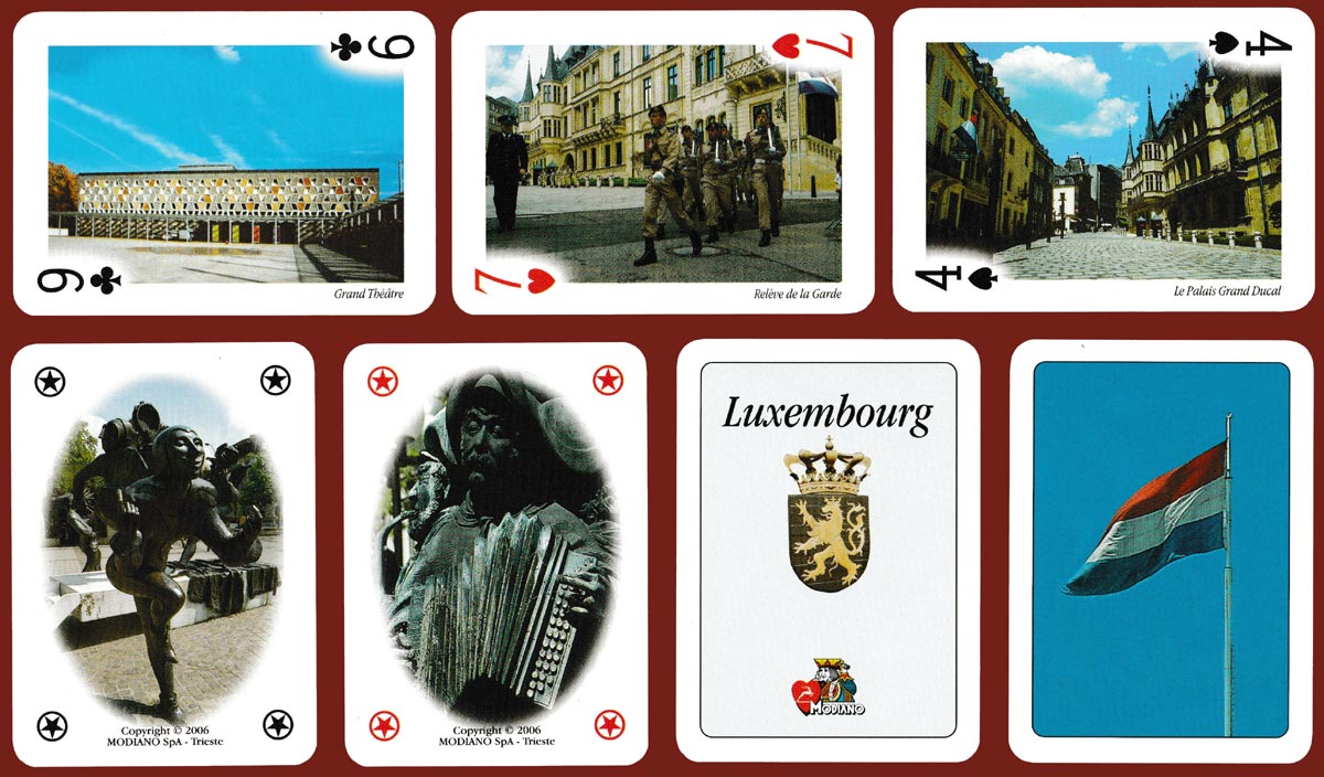 Above: Souvenir of Luxembourg by Modiano SpA, Trieste, Italy, 2006. 52 cards + 2 Jokers + title card in tuck box. Size: 63 x 88 mm.