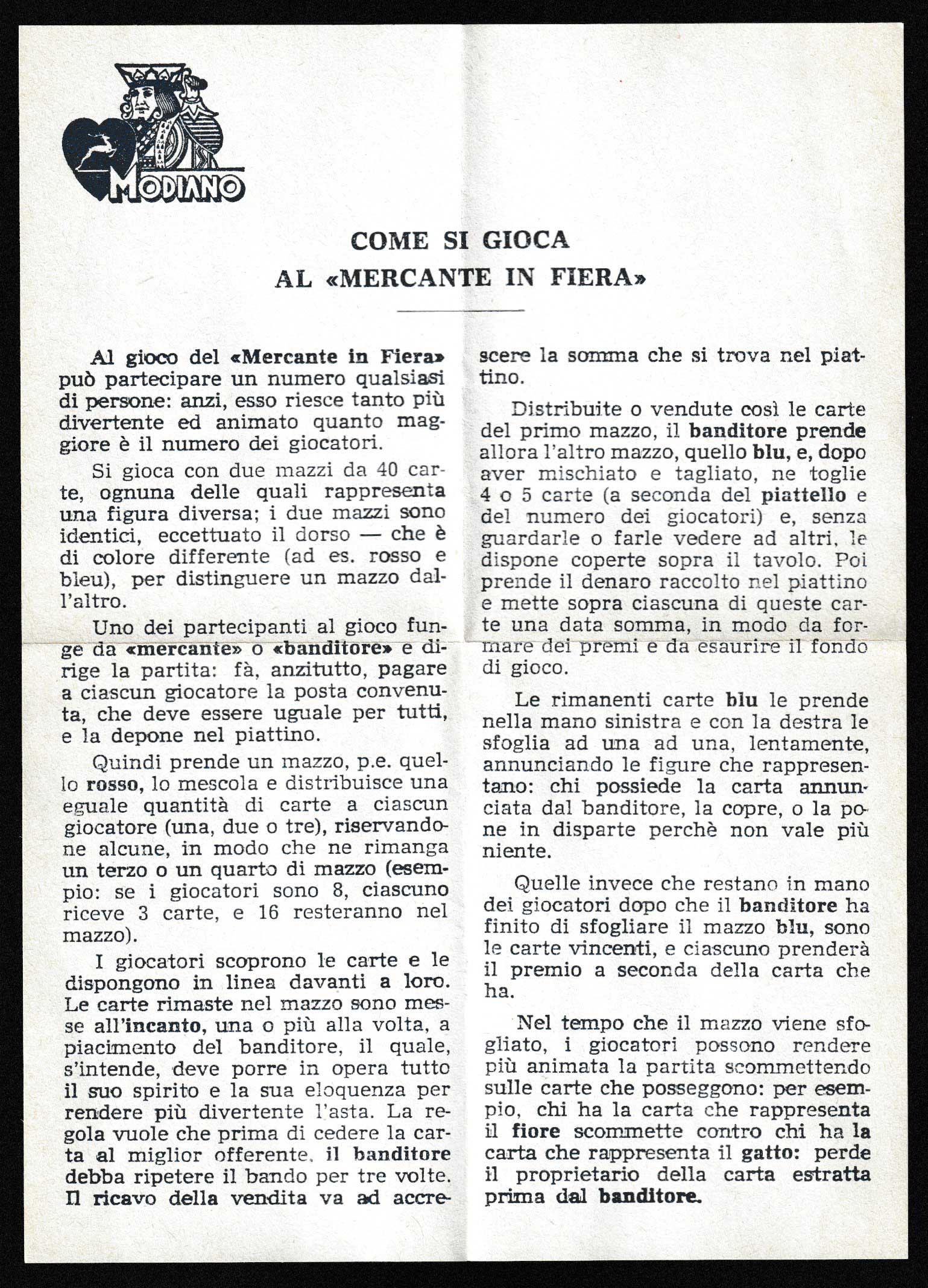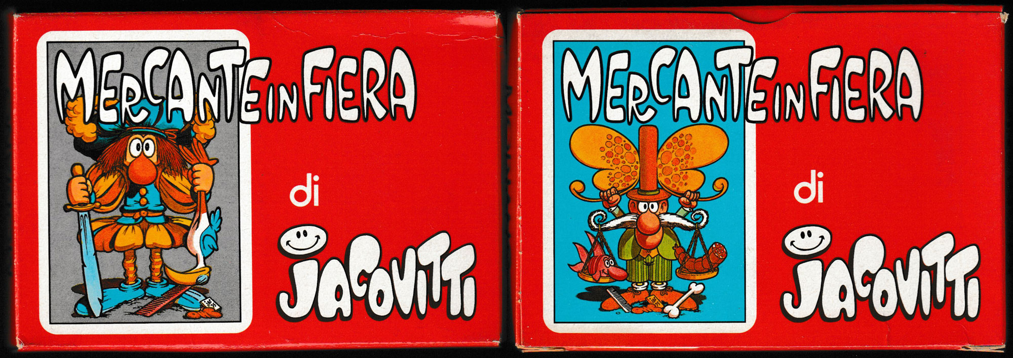 Above: ‘Mercante in Fiera di Jacovitti’ card game printed and published by Modiano, Trieste, Italy, c1975. 2 x 40 cards + leaflet with rules in Italian in tuck box. Size: 63.5 x 88 mm.