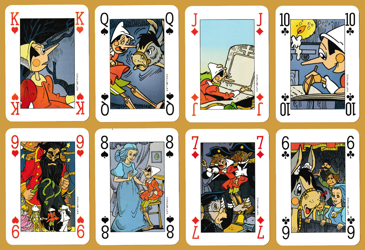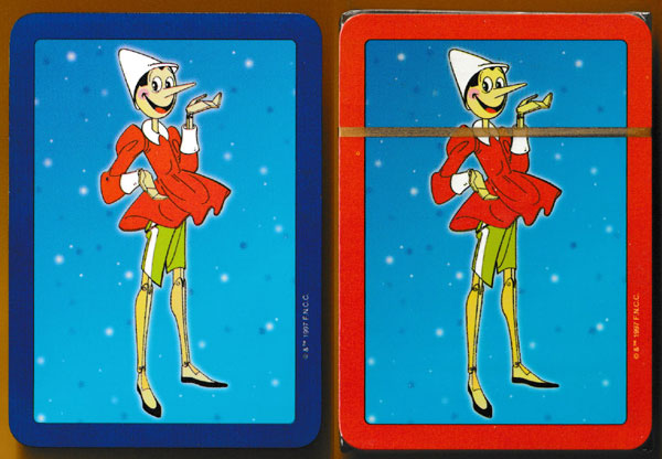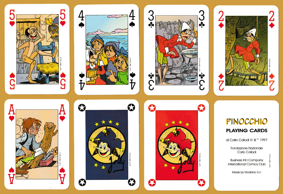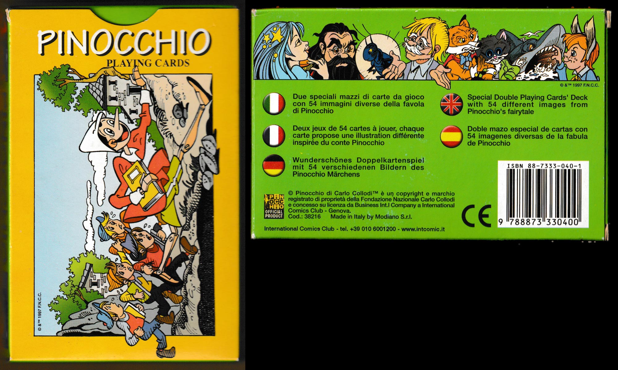 Above: Pinocchio playing cards made by Modiano S.r.l., Trieste, for International Comics Club, Genoa, Italy, 1997. 2 x 52 cards + 2 Jokers + 1 title card in double tuck box with plastic tray. Size: 63 x 88 mm. © & ™ 1997 Fondazione Nazionale Carlo Collodi