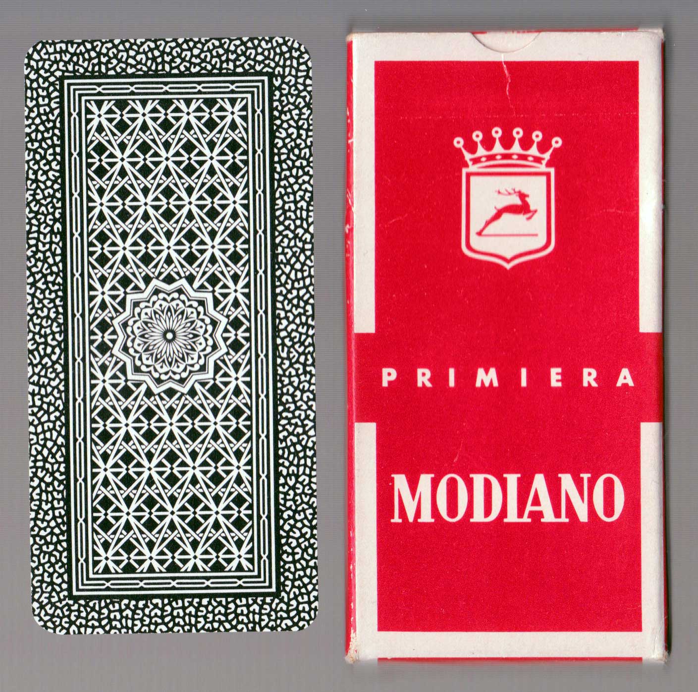 Above: Primiera Bolognese by Modiano, c.1975. The Primiera deck has 40 cards: Ace to 7, Knave, Knight, and King. The numeral cards have interlaced swords and staves. The object of the game is to attain the highest possible hand. The player who holds the prime, a sequence of the best cards and a good trump, is sure to be successful over the adversaries – hence the game’s name. Images courtesy Rex Pitts.