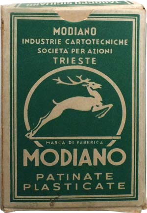 Above: Tarocco Siciliano No.94 manufactured by Modiano S.p.A., Trieste, c.1960, 64 cards in box. An ace of coins is included for the purpose of carrying the tax stamp.