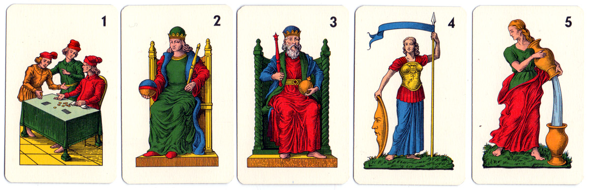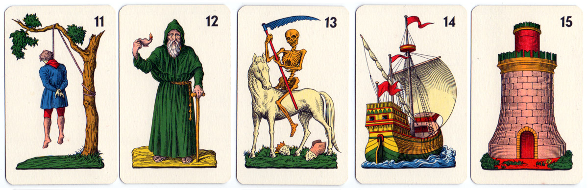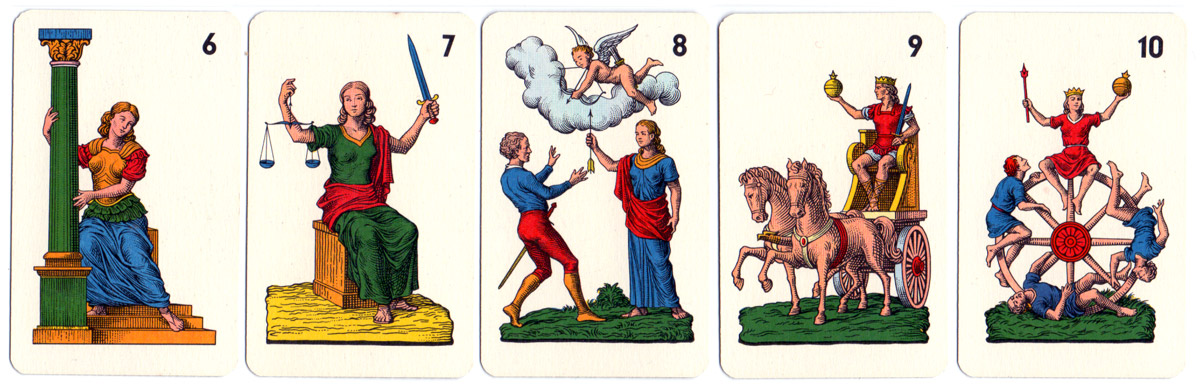 The highly individual “Sicilian Tarot” has the Italo-Portuguese suit system (found also in Minchiate and some early Spanish packs) with straight, interlocking swords and batons, maids instead of jacks in all suits, and suppresses the four aces and lower numeral cards. Several of the 22 trumps have new classicised images replacing the older ones which were seen as offensive (and some are derived from Minchiate). Trump 1 (i Picotti) shows some lads playing. The banner held by trump 4 sometimes reads “La Constanza” which identifies it as one of the ethical virtues. Trump 11, the Hanged Man, shows a man lynched from a tree. Trump 14 shows a ship, trumps 16, 17 & 18 are not the customary scenes. Trump 19 shows Atlas holding the celestial globe and trump 20 shows Jupiter. In early packs the trumps carried roman numerals but from the 19th century arabic numerals are found.