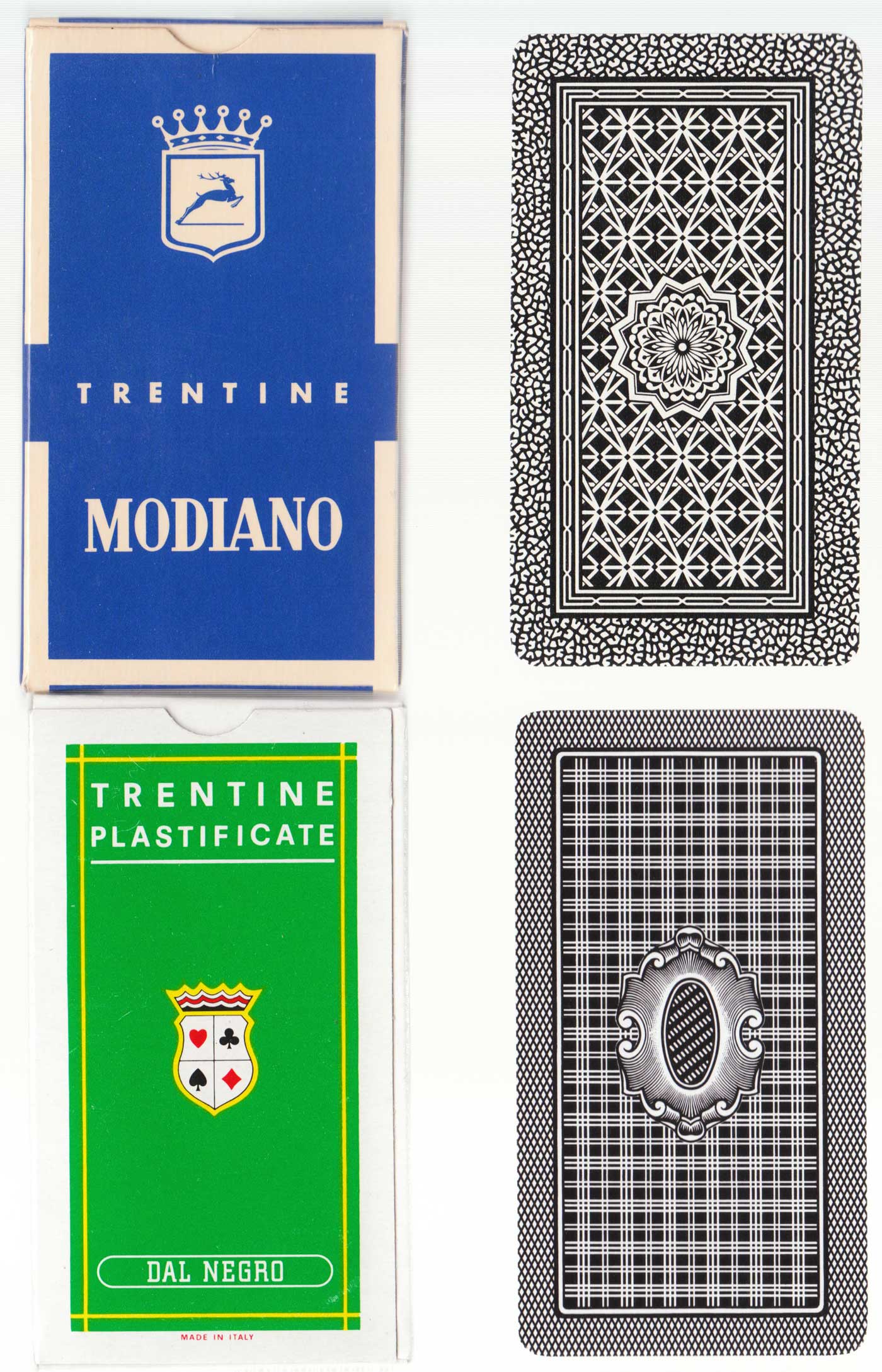 The Trentine, or Trento pattern, along with the Brescia and Bergamo patterns, are all modelled on a common Italian-suited ancestor. Packs have 52 or 40 cards, single-figure courts, narrow elongated cards. Characteristic features include a female portrait on the ace of coins; cupid with bow and arrow on ace of cups; a dog leaping besides the jack of cups; the jacks of both batons + swords hold weapons in both hands.