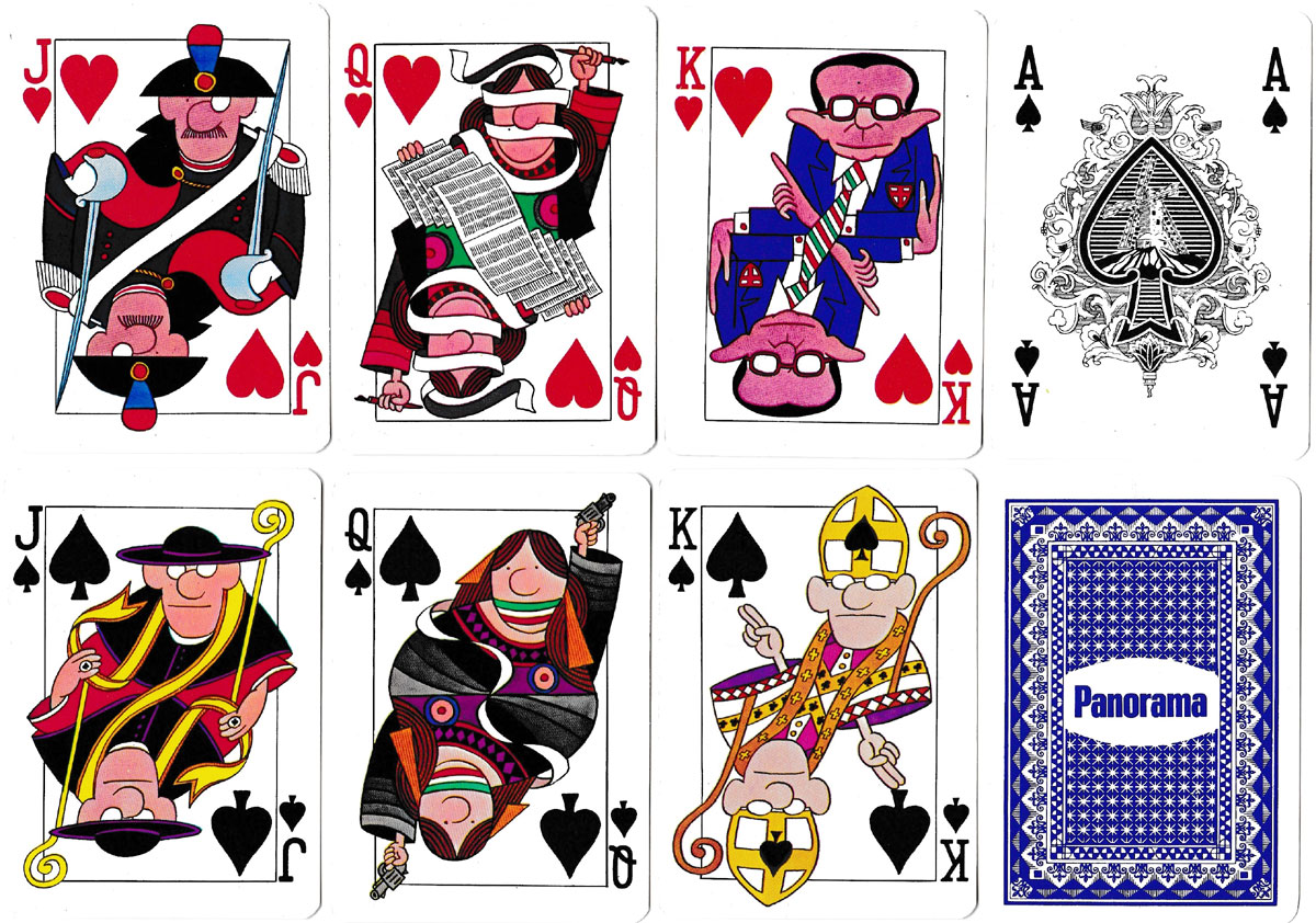 This pack was made by Windmill Playing Card Co. of Hong Kong for Arnoldo Mondadori Editore, the largest publishing company in Italy, for inclusion in Panorama, a weekly news magazine published in Milan. The court cards and 2 jokers feature the brilliant original designs of satirical cartoonist Alfredo Chiappori (1943-2022). The ace of spades shows a windmill within the central suit sign, while the courts show cartoons of legal, religious, military and business figures.