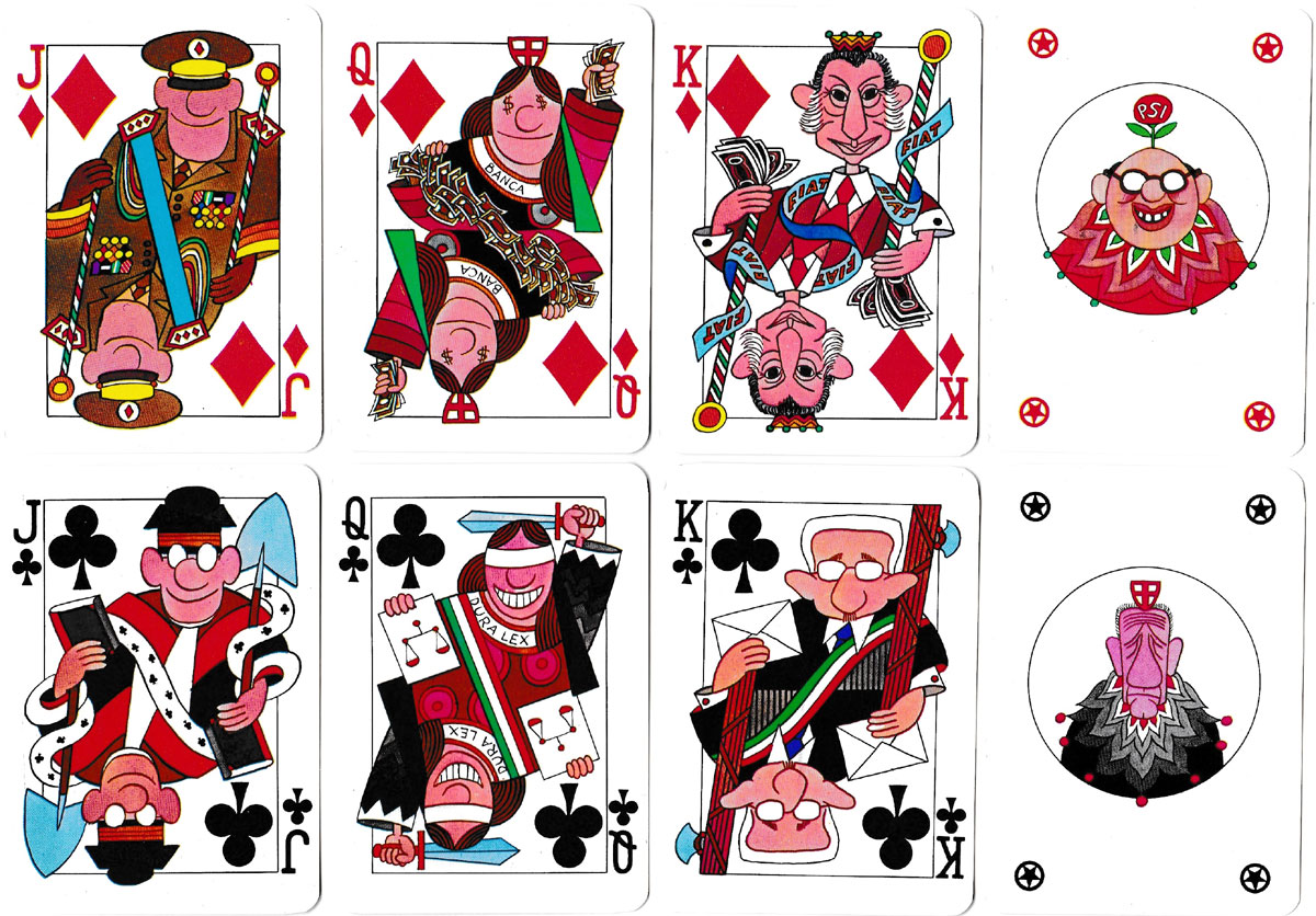 For the record, Giulio Andreotti (1919-2013) is represented on the King of Hearts, while the King of Diamonds depicts the head of Fiat, Gianni Agnelli (1921-2003). The King of Clubs probably represents Giovanni Leone (1908-2001). The red Joker is almost certainly Bettino Craxi (1934-2000). The same back design also exists in red. Sorry I don't know who is on the black Joker. R.S