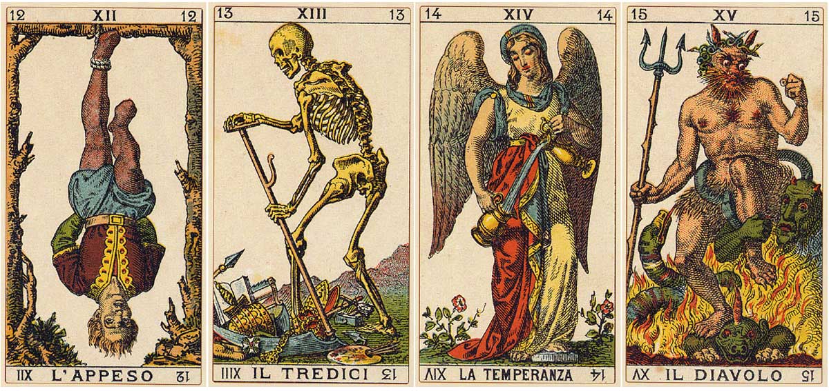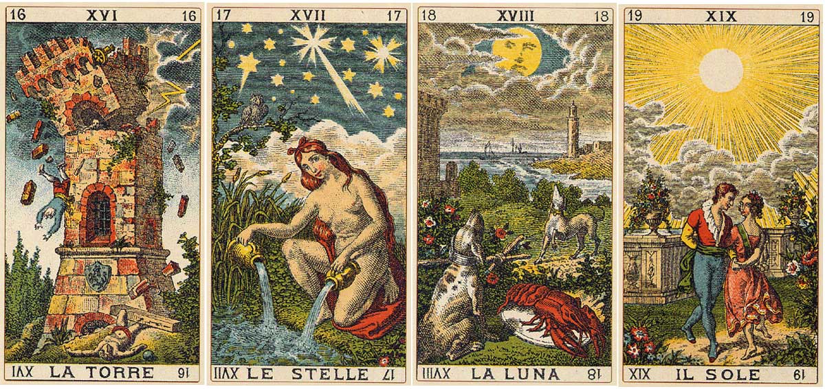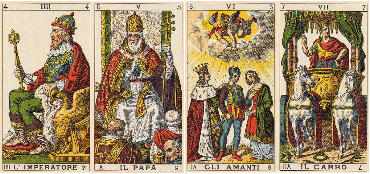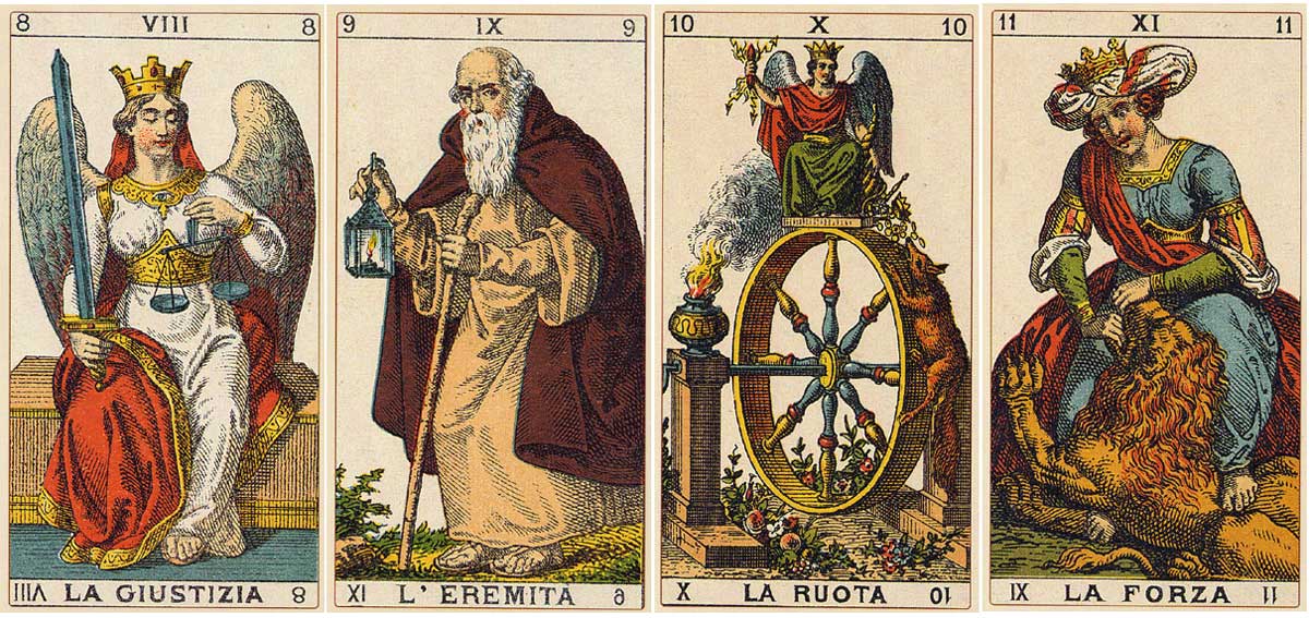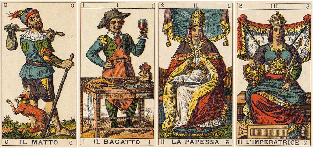 See also: “Tarocco Neoclassico” c.1810 • Carlo Dellarocca's “Tarocchino Lombardo” 1835 • Mitelli Tarocchini • Tarocco della “Corona Ferrea” • Tarocco Piemontese • Matarelli Transformation • Tavaglione Stairs of Gold Tarot • Minchiate • "Etruria" Minchiate • Tarocchi di Mantegna • Tarocco Bolognese • Visconti Tarocchi.
