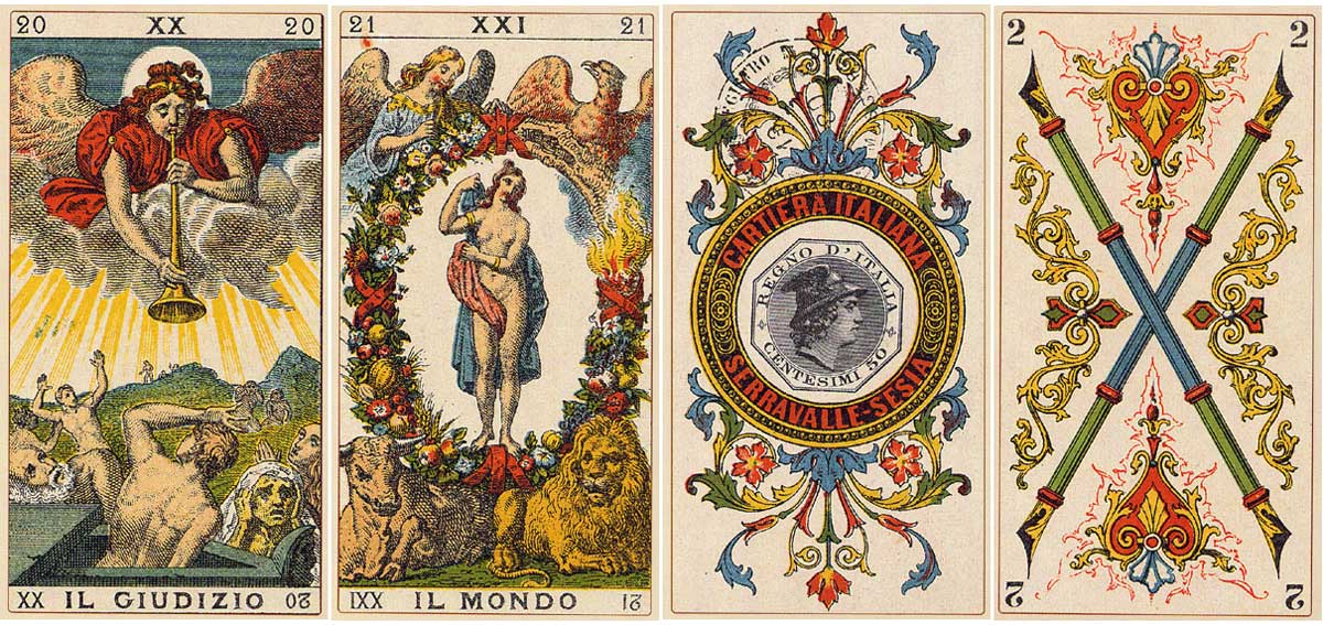 Above: Serravalle-Sesia Tarot originally published by Fratelli Avondo, c.1880; facsimile edition by Lo Scarabeo, 2000. The card titles are in Italian. The Ace of Coins has the Italian duty stamp which reads: "Cartiera Italiana, Serravalle-Sesia". Size = 106x58 mm.
