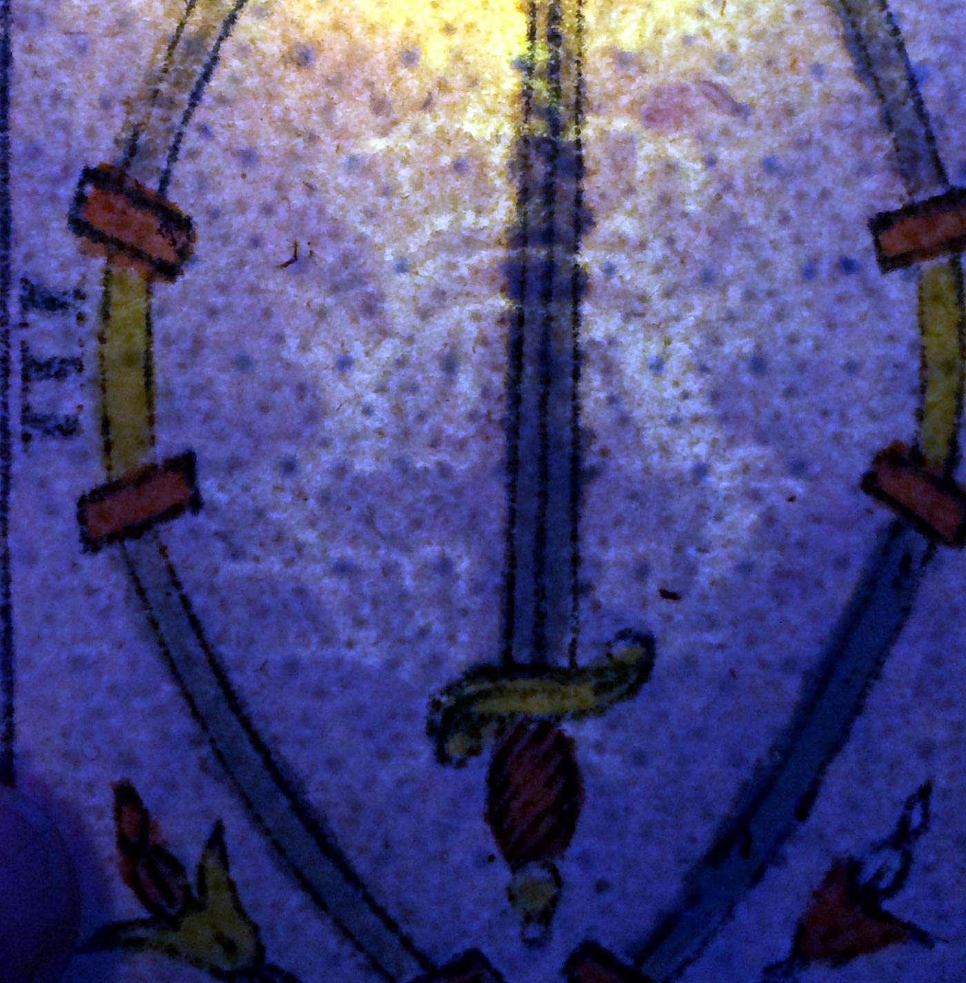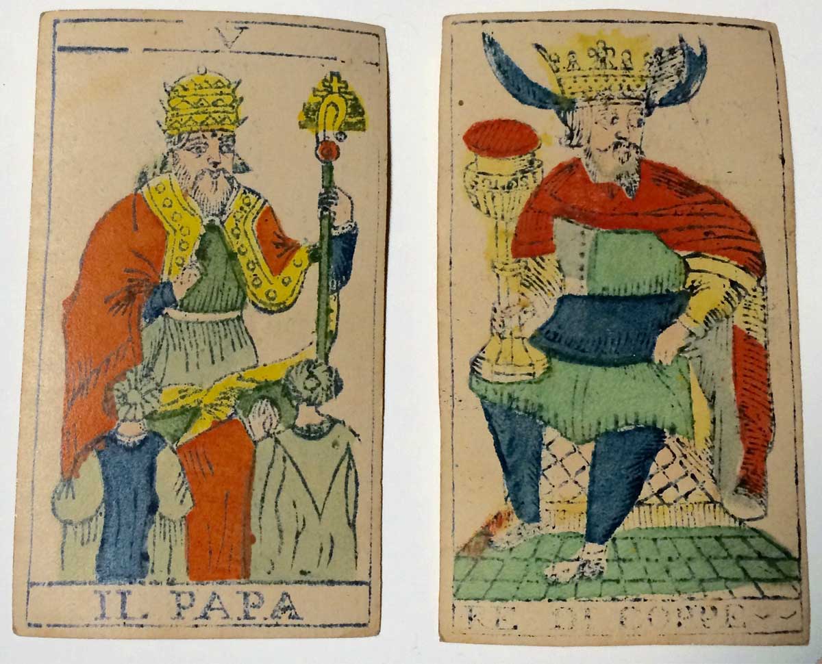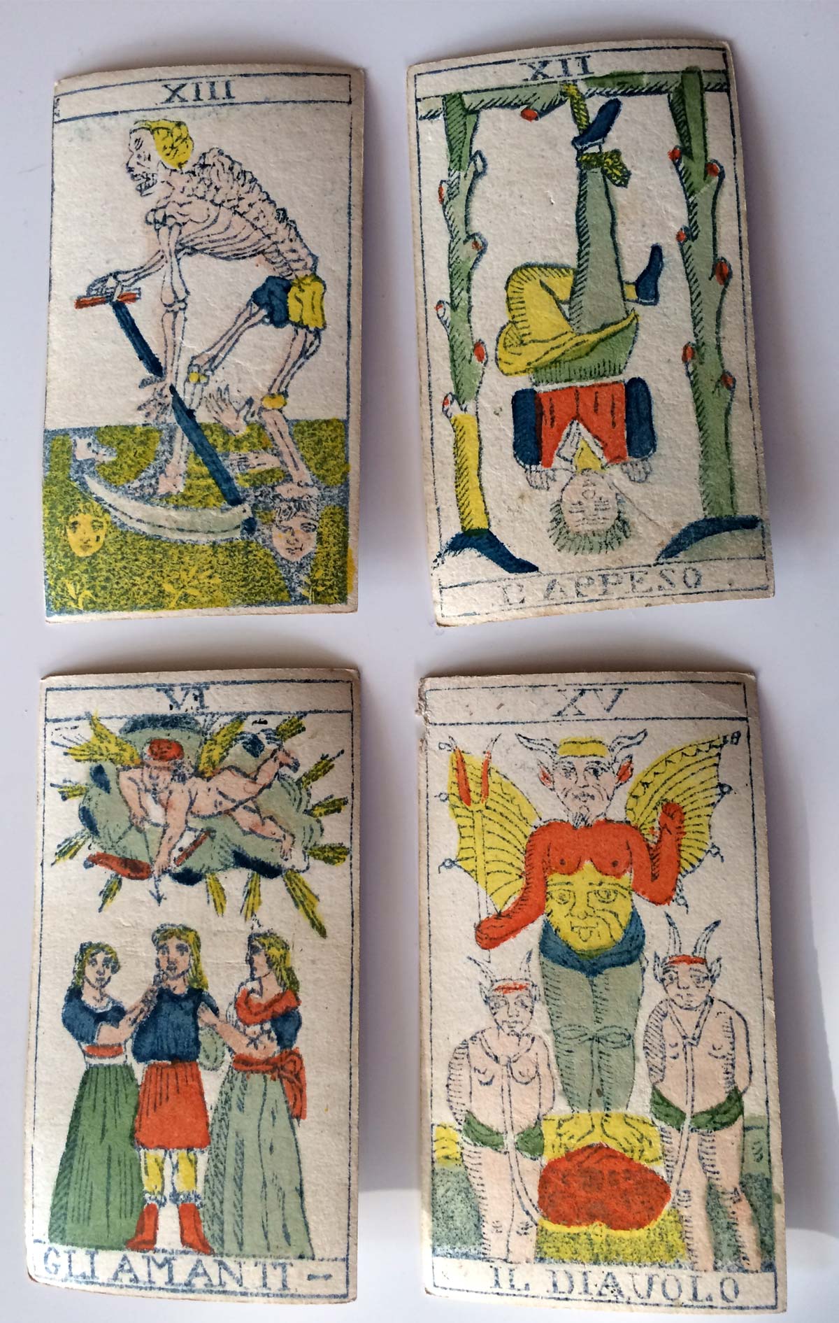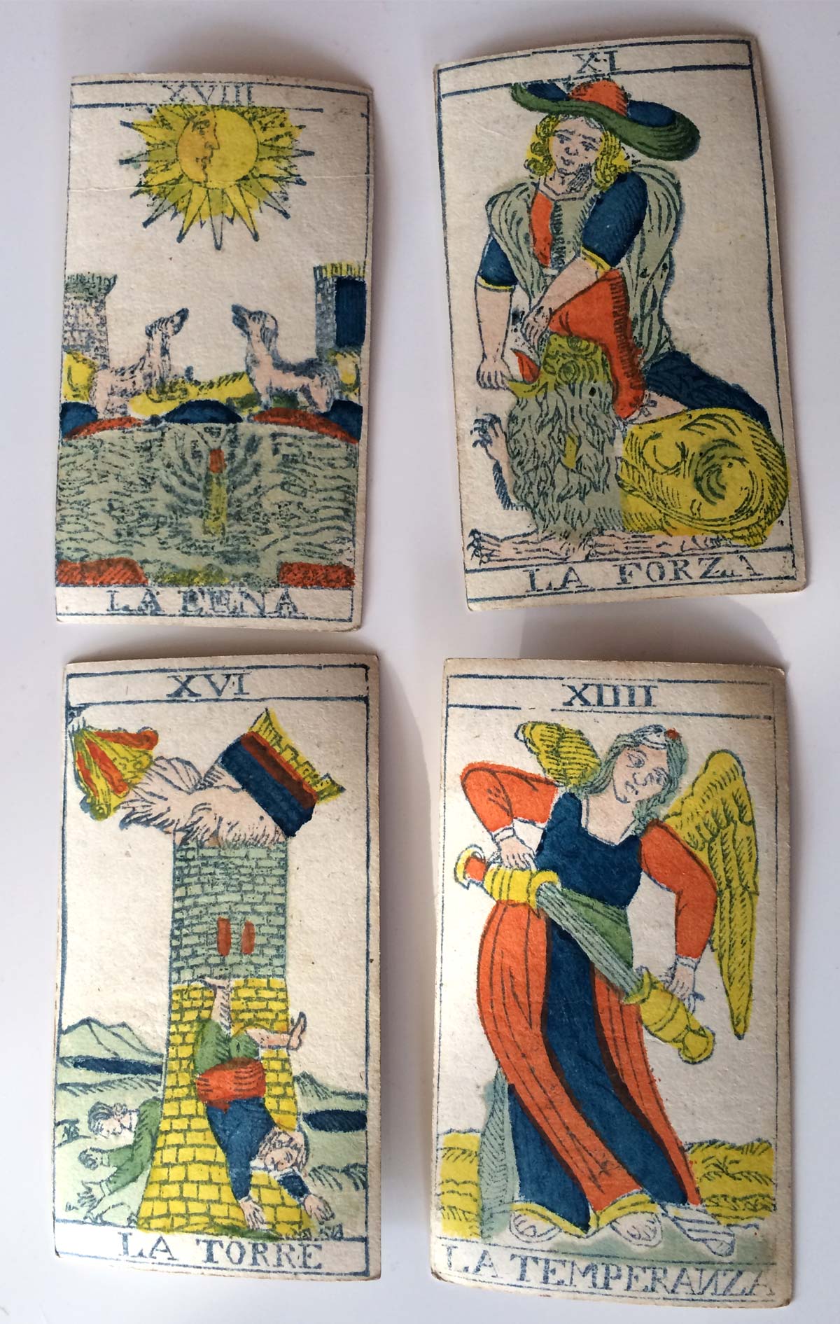 Above: Piedmont tarot from the mid-late 19th century printed in blue ink with stencilled colours.