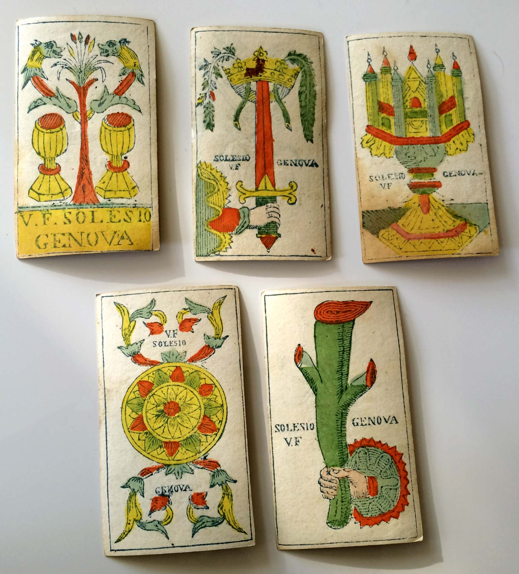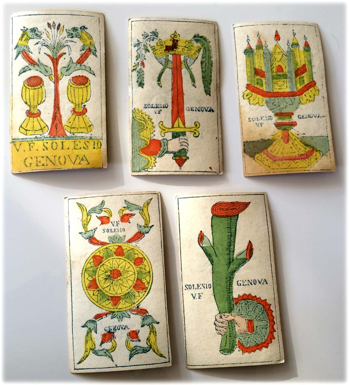North Italian Piedmont tarot deck published by Solesio of Genoa c.1860. The Solesio family was a dynasty of card-makers first recorded in the early 17th century, with branches in Italy and Spain. Factories were operated by successive descendents of the family but it is not clear who V.F. Solesio was, possibly Vittorio Filippo Solesio (1846-1893), Faustino's son, as the original inscription on the two of cups woodblock appears to have been altered, and V.F. Solesio overprinted onto blank space on the four aces. The Italian branch of the business survived into the 1980s, exporting extensively and developing cheaper production methods, putting many competitors out of business.