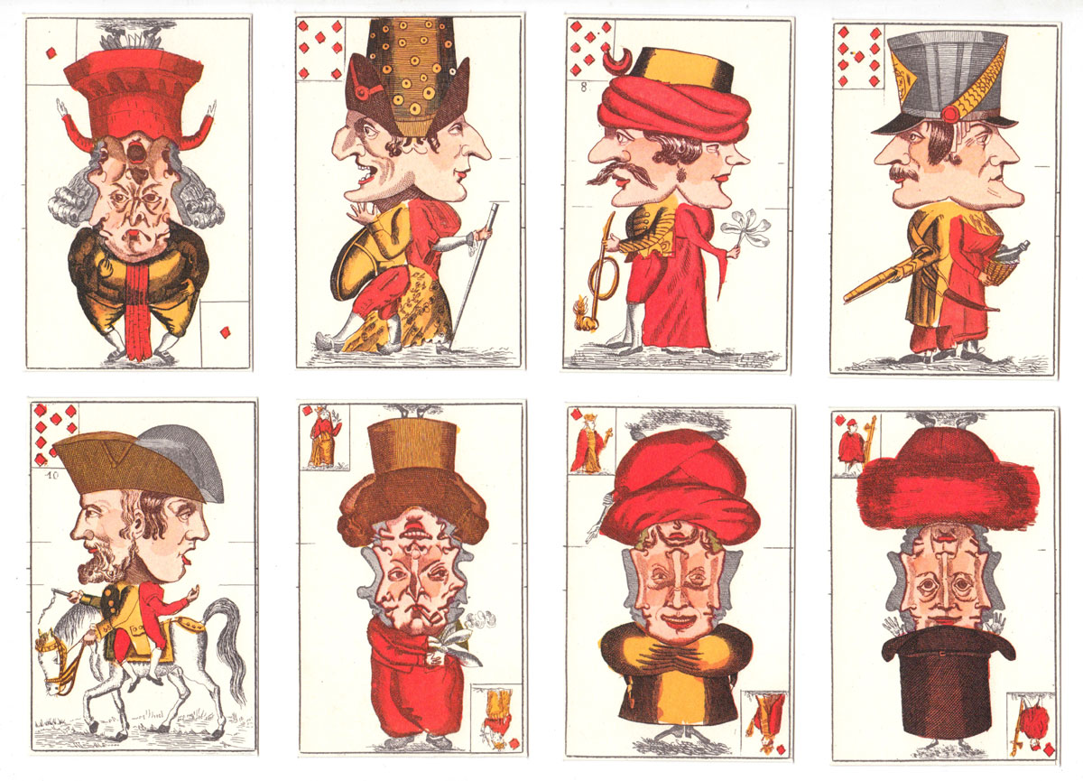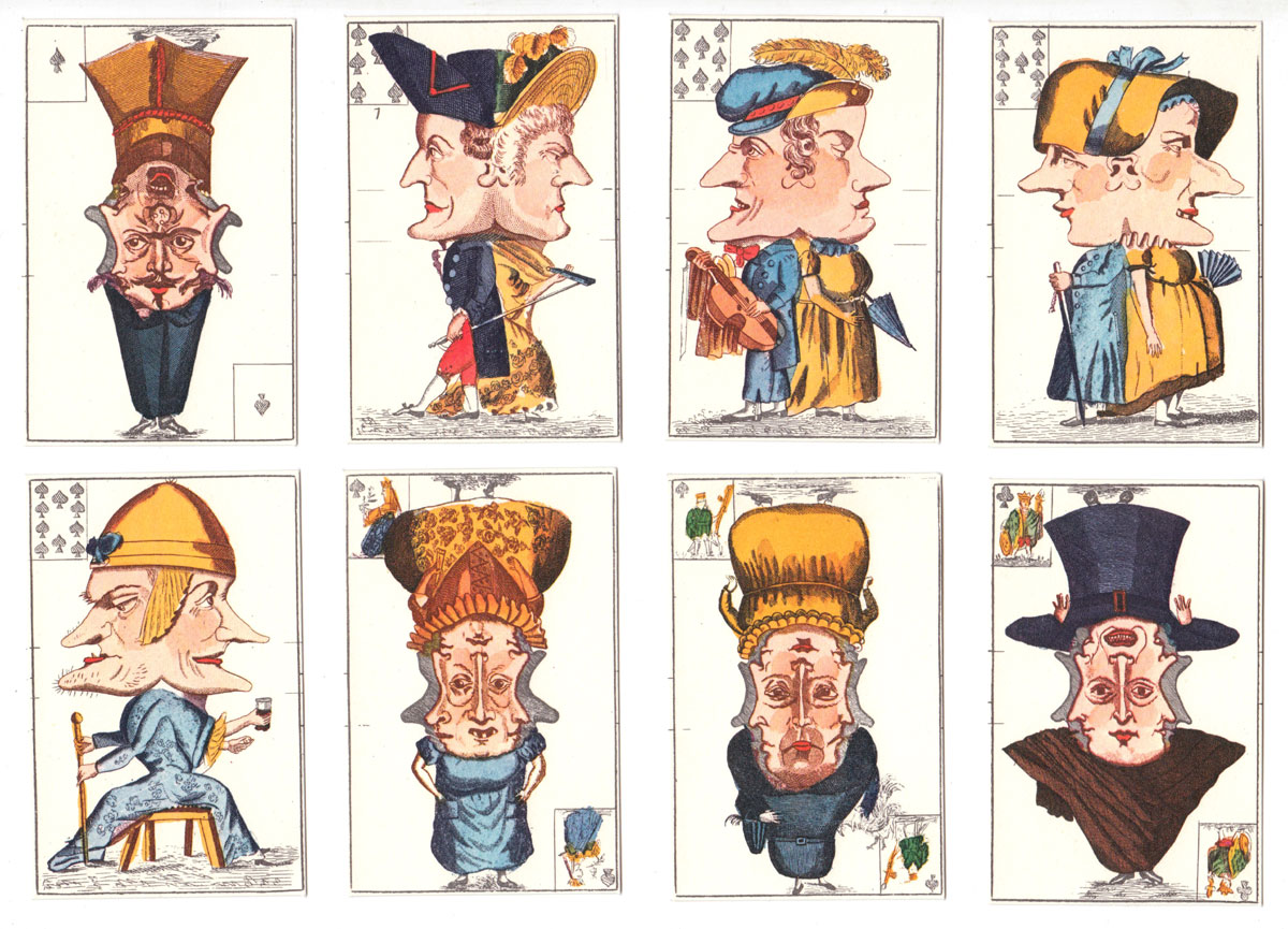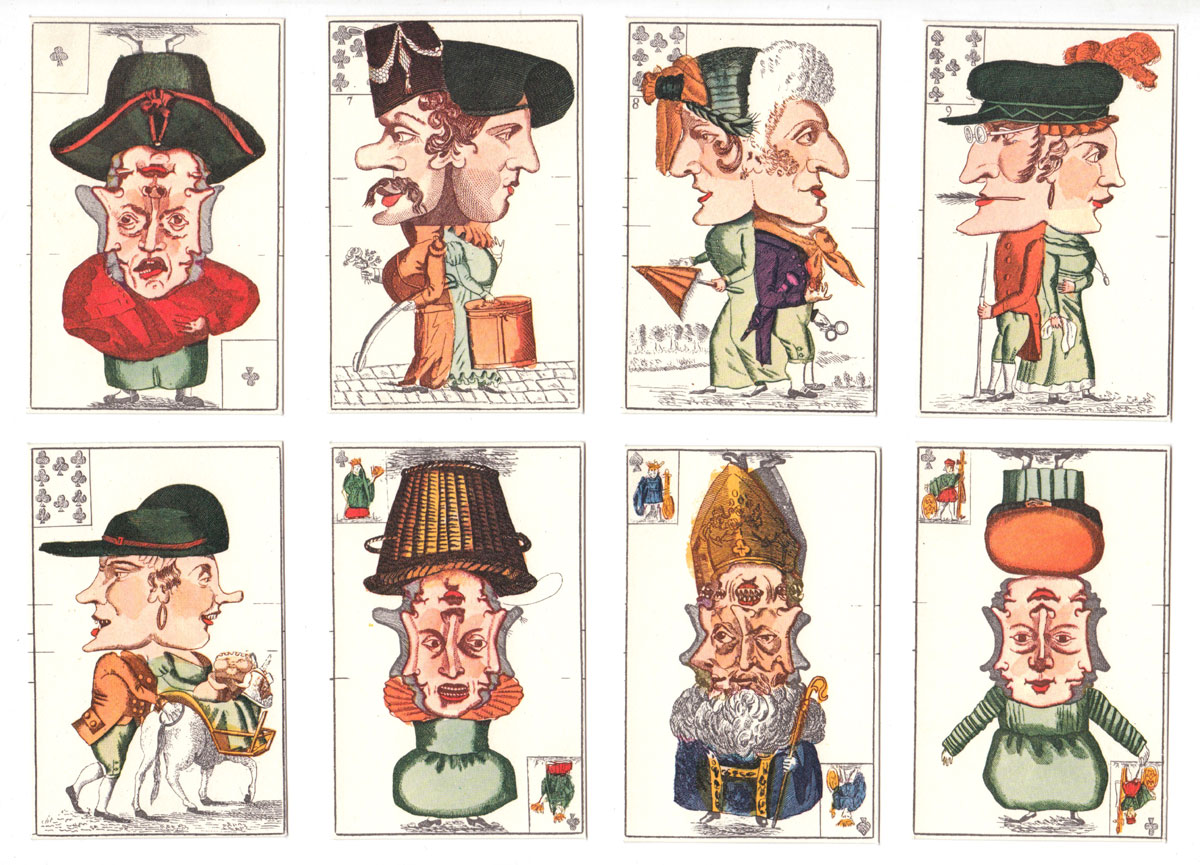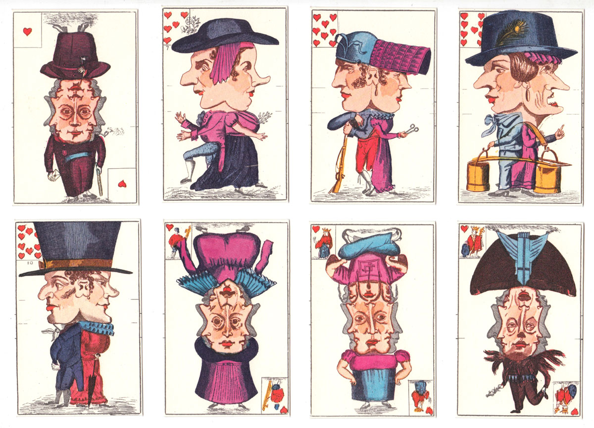 Jeu Grotesque was first published in France c.1800 featuring satirical and comic caricatures with enormous heads designed to excite laughter as well as for playing card games. Each card has a miniature playing card in the upper left-hand corner. The 12 court cards are actually double-ended with a different picture each way, whilst the numeral cards (A, 7, 8, 9 and 10) are caricatures of Janus figures. The original cards each measure 10.8 x 6.8 cm.