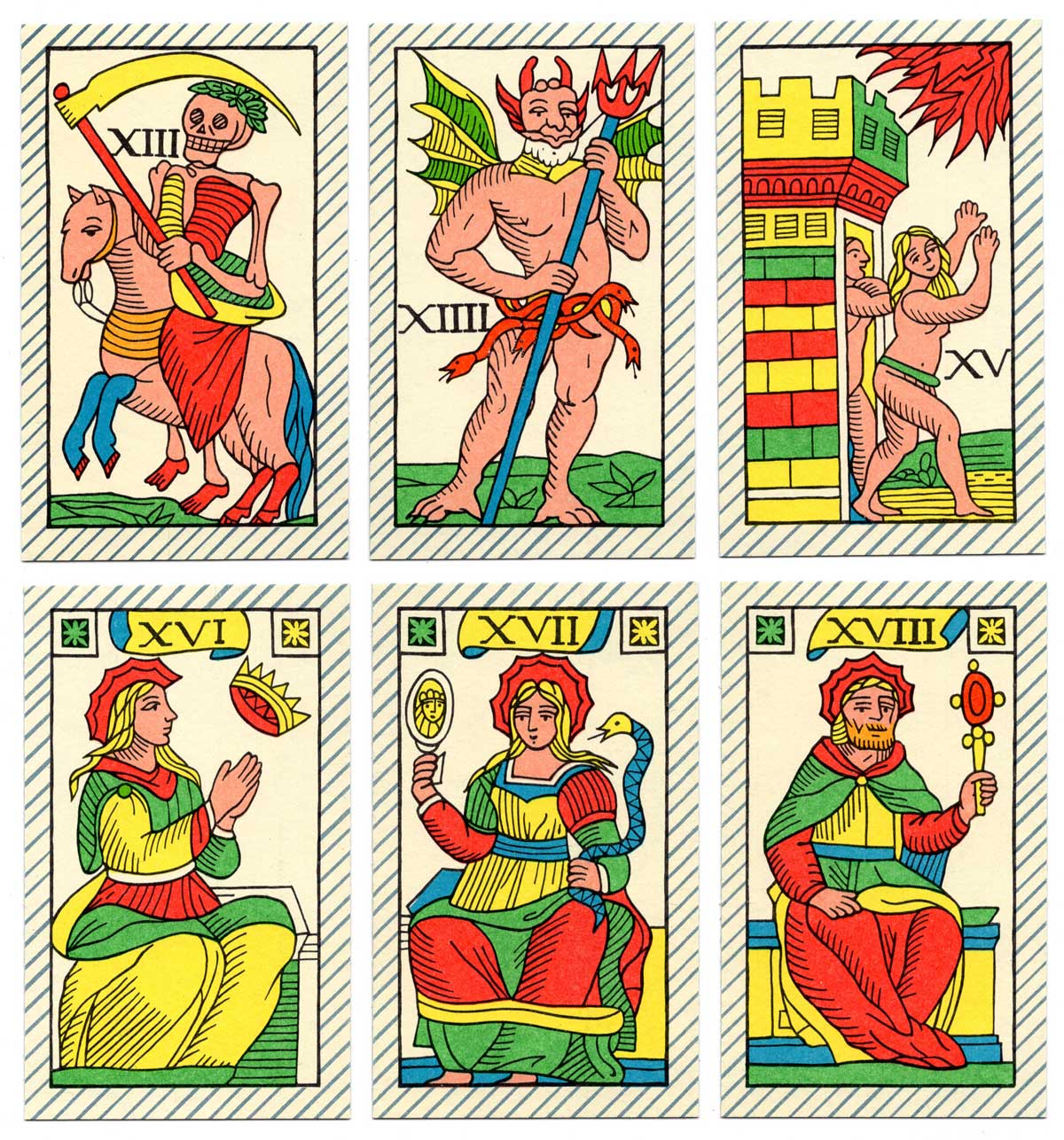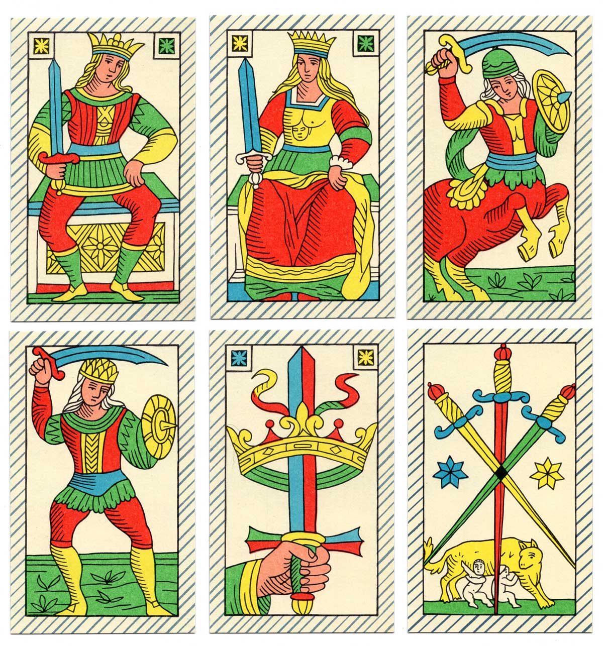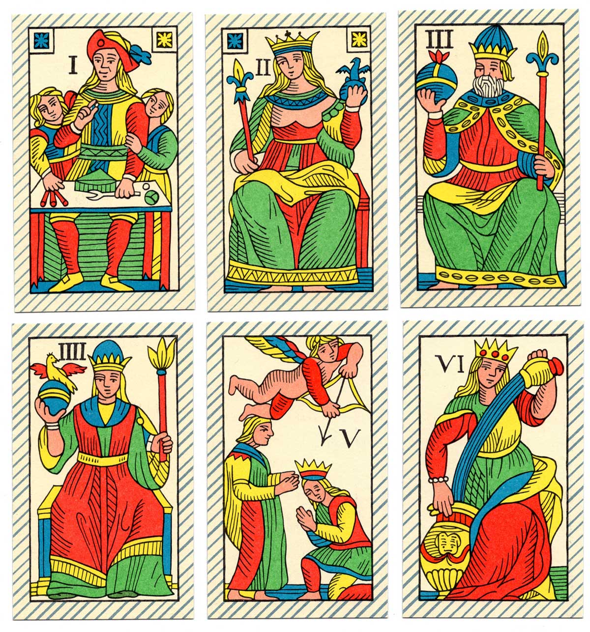 Minchiate is a card game that originated in Italy during the 16th century. It uses a deck of cards similar to the Tarot but extended with additional allegorical and symbolic images. A traditional Minchiate deck consists of 97 cards, as opposed to the 78 cards in a standard Tarot deck. The trumps are numbered up to XXXV and then there are six unnumbered cards ending with The Fool. The maker’s name can be seen on trump X, on the two of batons and on the reverse. Today the game has largely faded into obscurity.