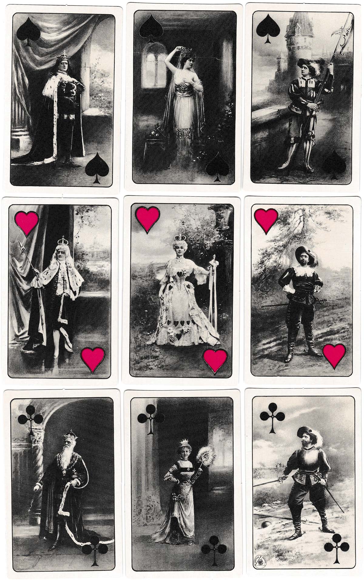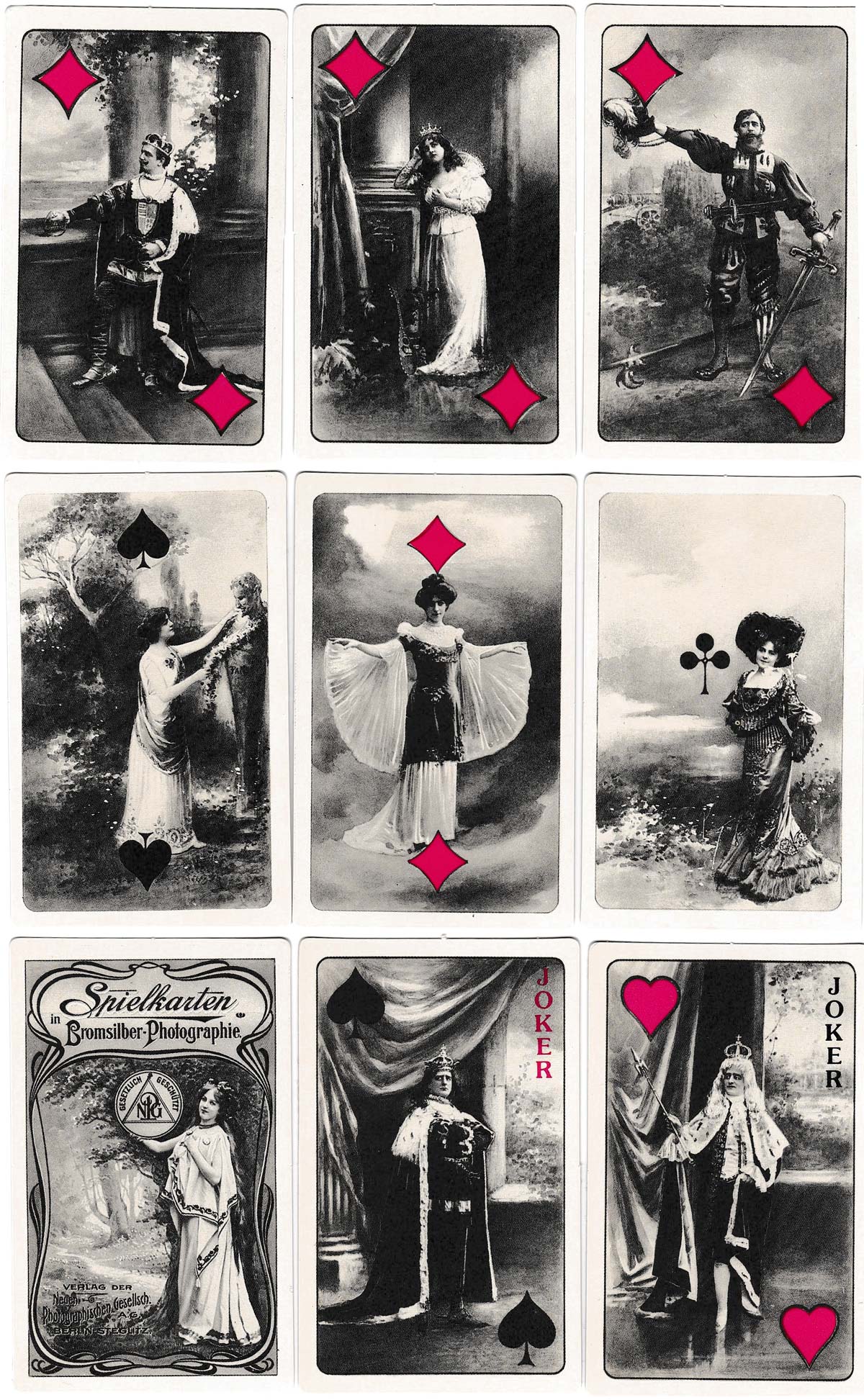There are 52 cards, plus 2 jokers and an extra card showing a young woman holding a medallion which reads “Gestzlich Geschutzt NPG”. The court cards are identified by the appropriate suit sign at the top left and bottom right of the card, whilst the 2 of each suit is represented by the appropriate suit sign at the top and bottom centre of the card. All cards have plain backs, square corners and no corner indices. The cards, including the pip cards, show photographs of actors and actresses from the Berlin Theatre wearing stage costumes and standing against painted set decorations. The Ace of Hearts has two tax stamps and there is also a maker's trademark on the Jack of Clubs. See the box►