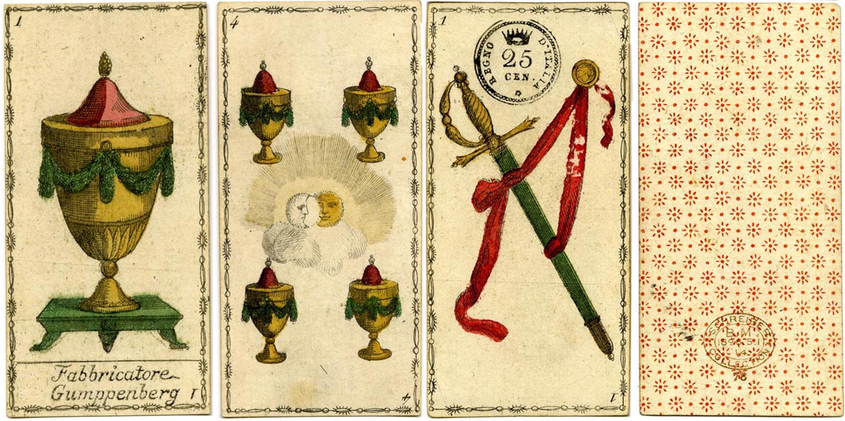 On the ace of cups is "Fabbricatore Gumppenberg". On the ace of swords is a duty stamp. All the cards have a narrow ornamental border. Names of the court cards and atutti in Italian. Total 78 cards.
