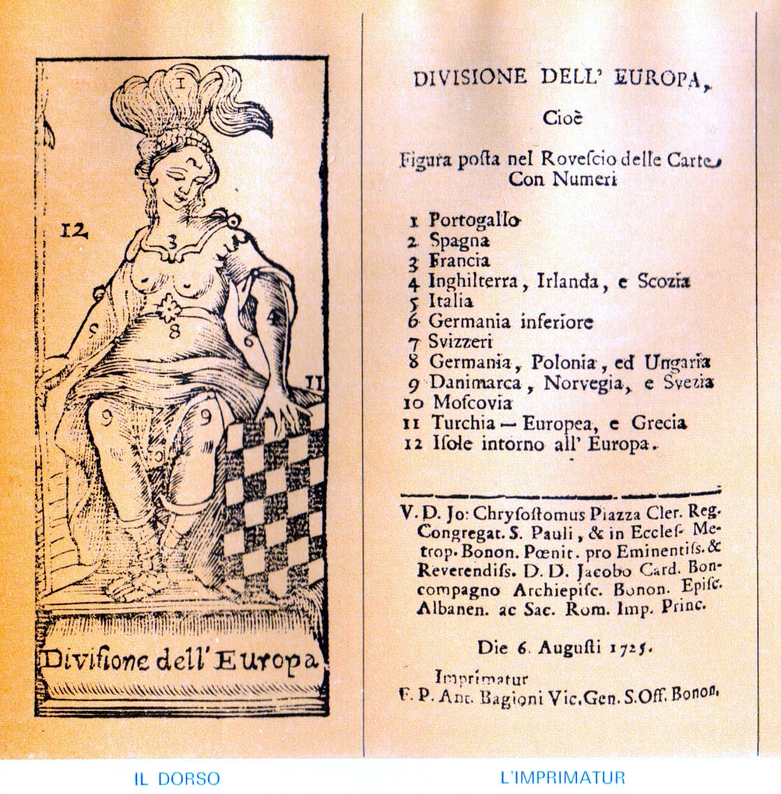 Above & left: “L’Utile col Diletto, ossia geografia intrecciata nel giuoco de Tarocchi”, a set of 62 Geographical and Heraldic Tarocchi cards created by Luigi Montieri and published in Bologna, 1725. The reverse shows an allegorical figure titled “Divisions of Europe”. The accompanying booklet titled “L'utile col diletto, ossia geografia intrecciata nel Gioco dei Tarocchi, con le insegne degli Illustrissimi ed Eccelsi Signori Gonfalonieri ed Anziani di Bologna dal 1670 al 1725” gives a key to the heraldic attributions and divisions of Europe which are illustrated on the cards. The Trump cards contain the geographical tables and the minor cards the armorial shields. The former are etchings, the latter woodcuts. Every card has its symbol or suit-mark at the top. This is of course a non-standard version of the tarocchino of Bologna; originally the 2, 3, 4 and 5 of the numeral cards were omitted, but in the present sequence the 7, 8, 9 and 10 of each suit are omitted, probably to save space in the top parts of the cards.