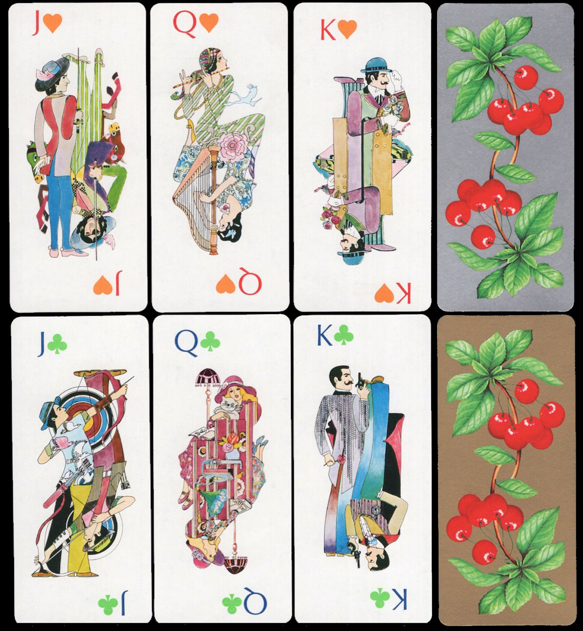 Narrow sized lifestyle themed playing cards manufactured by Angel Playing Cards Co Ltd, Japan, featuring court cards adorned with fashion-inspired illustrations. Each court card is reversible to show a different design (the same art deco-inspired designs were also used in “Roaring Twenties” playing cards by Angel Playing Cards which were supposed to evoke the spirit of that era). In this version the indices and suit symbols have been given a different typographic treatment. The back designs are of cherries on a branch, one with a gold background and the other with a silver background. The artist involved is not credited.