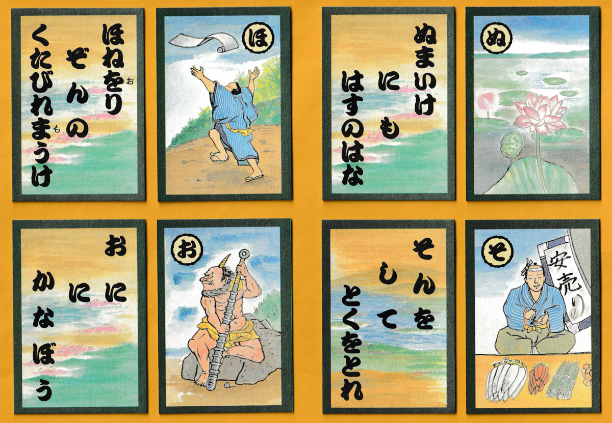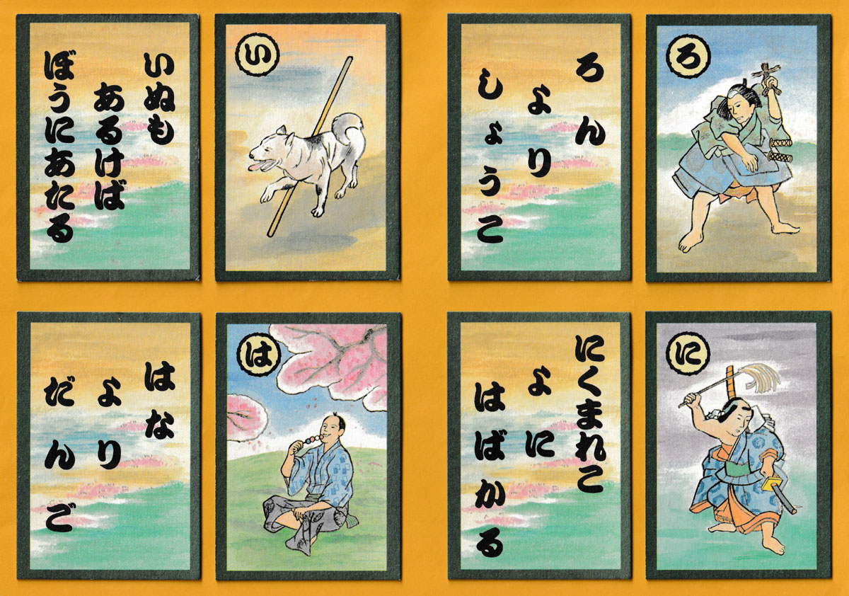 The cards themselves are on a stiff board, with square corners and plain green backs. Iroha Karuta belongs to the same family of card games as Uta Garuta (or Hyakunin Isshu)►