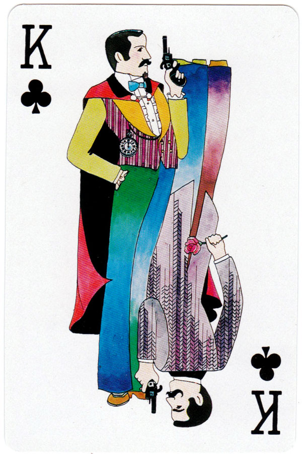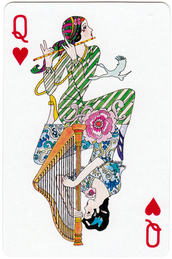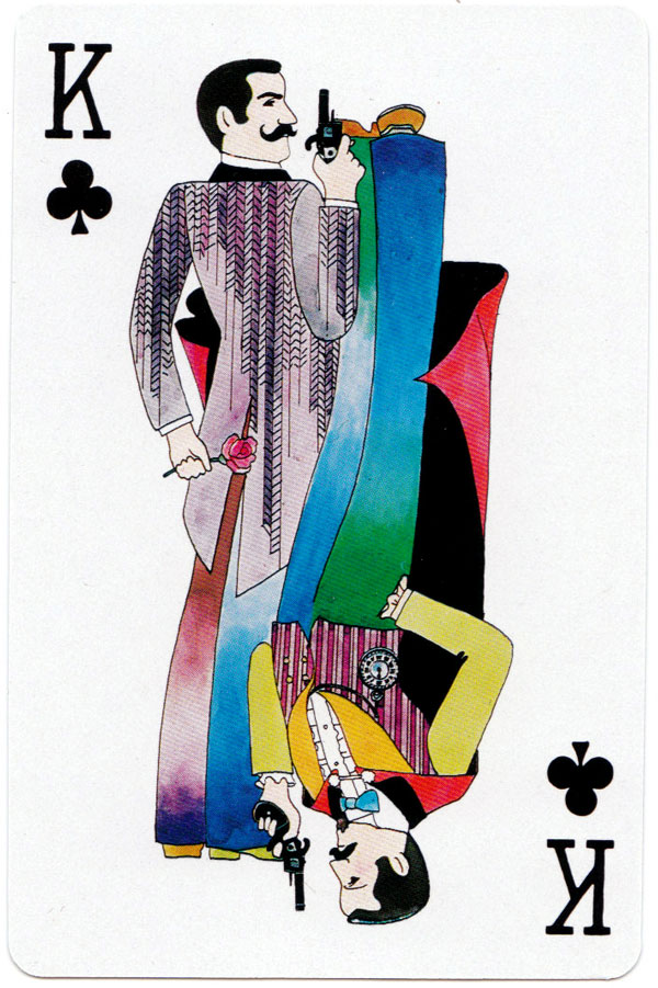 Above: “Roaring Twenties” playing cards published by Angel Playing Cards Co Ltd, Japan, 1980. 52 cards plus 2 Jokers. The reverse shows another double-ended design with gold or silver background (click to see more). Images courtesy Rex Pitts.