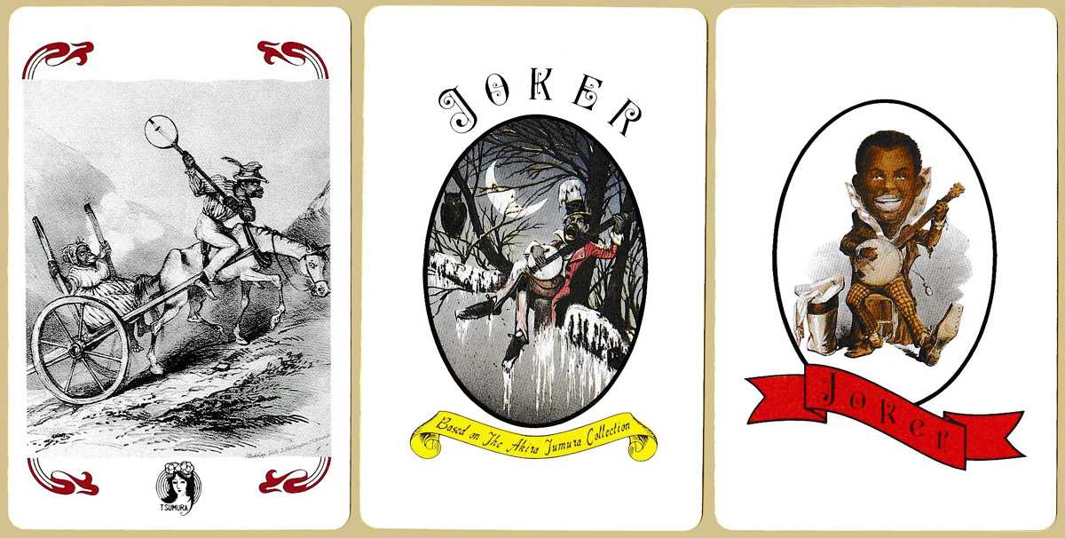 The back of the cards shows a banjo-wielding black male astride a donkey pulling uphill a black woman in a cart. Similarly, the jokers portray black figures – presumably in acknowledgement of the history of the banjo which was created by enslaved Africans and their descendants in the Caribbean and colonial North America. Beneath the image is a Tsumura cartouche. For information on the fate of Tsumura and the collection see here►